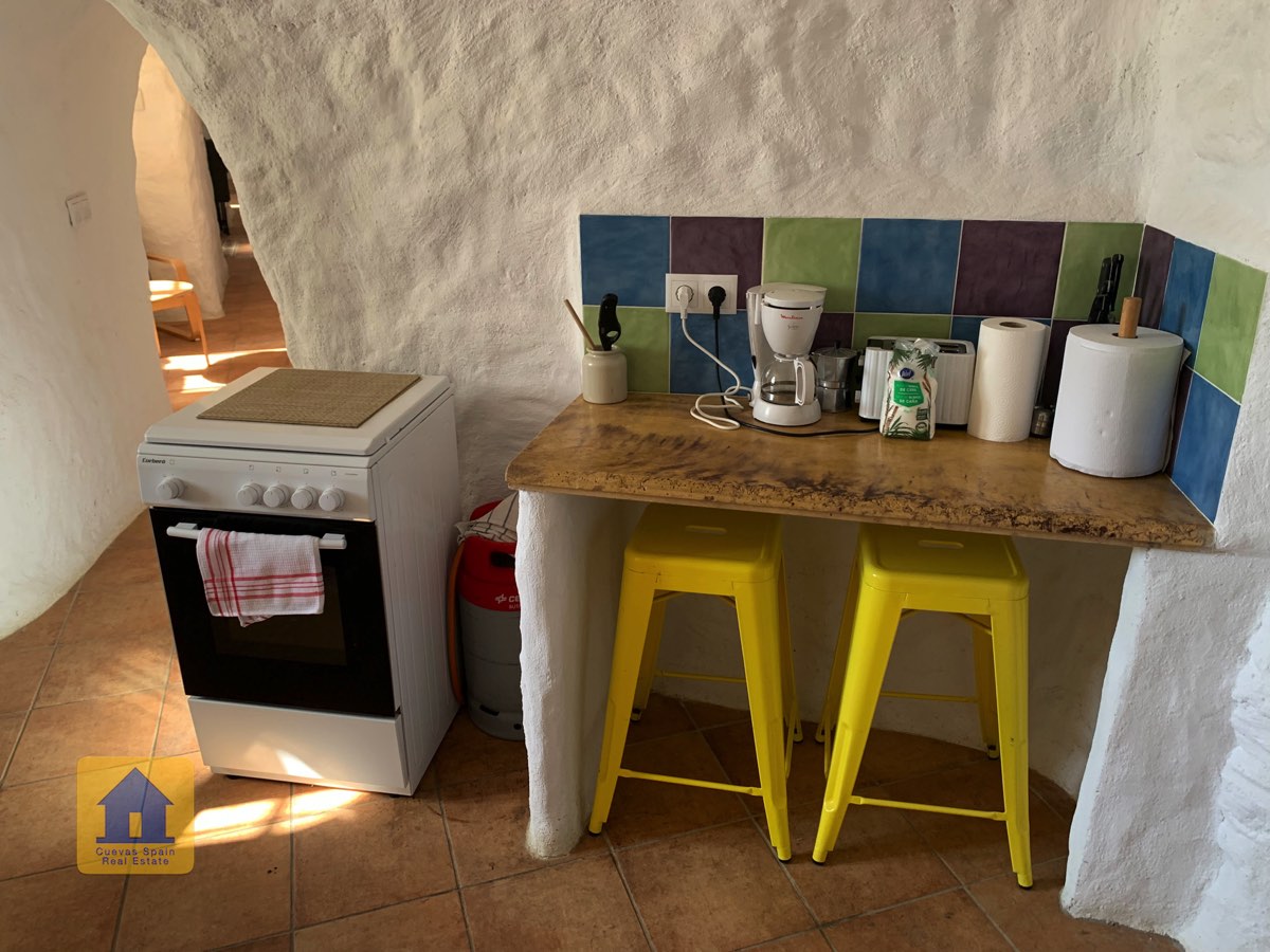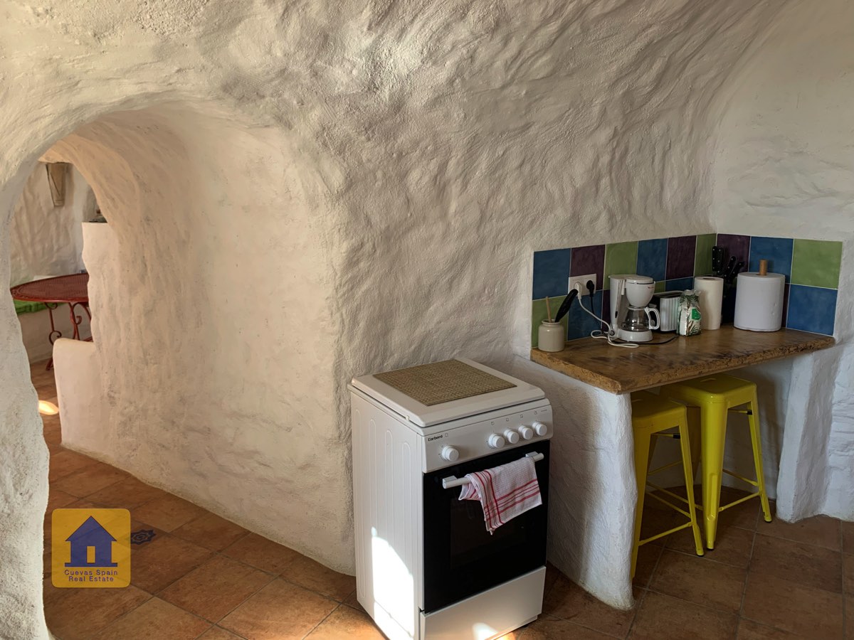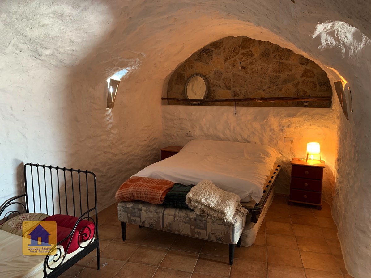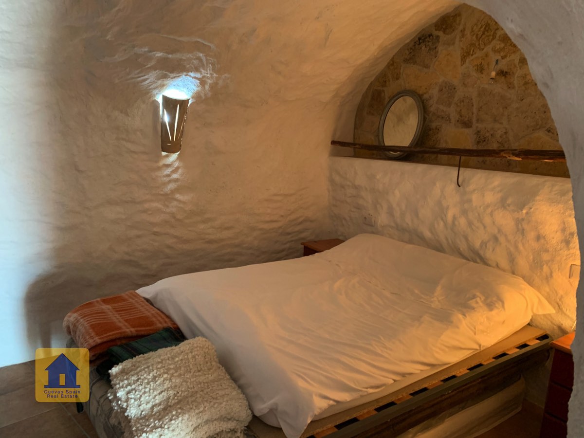 À l'intérieur, la maison troglodyte est lumineuse et aérée. Vous entrez dans un grand hall central avec un coin décoratif en pierre incrustée. Le hall mène directement à un couloir/chambre à coucher et à une chambre double confortable avec un mur de pierres incrustées au-dessus du lit. À gauche du hall central se trouvent un salon, une jolie salle de bains et une chambre double dotée d'un grand puits de lumière. À droite du hall principal se trouve une salle à manger ensoleillée avec de nombreuses étagères taillées dans la roche et un énorme ancien four à pain fini avec goût. La cuisine spacieuse a été conçue de manière pratique et comprend un bar à petit-déjeuner.