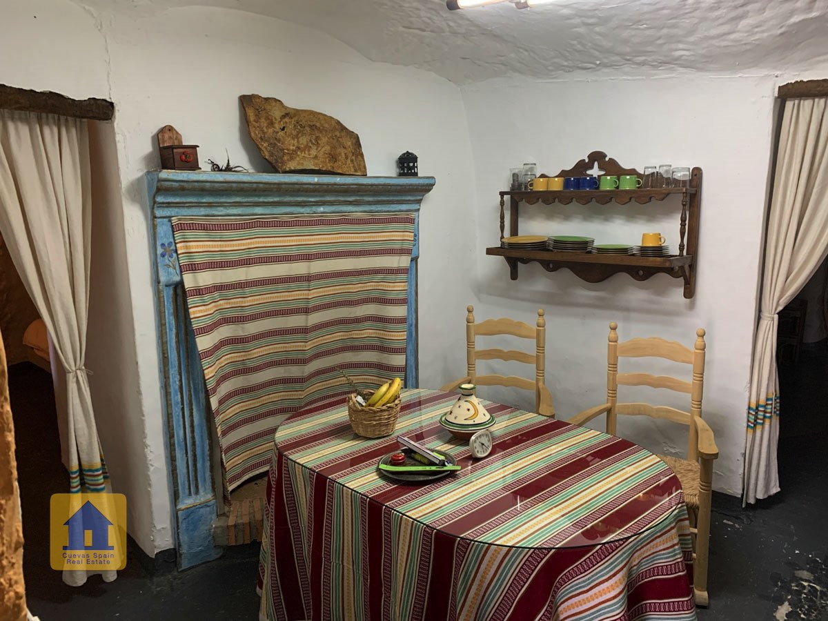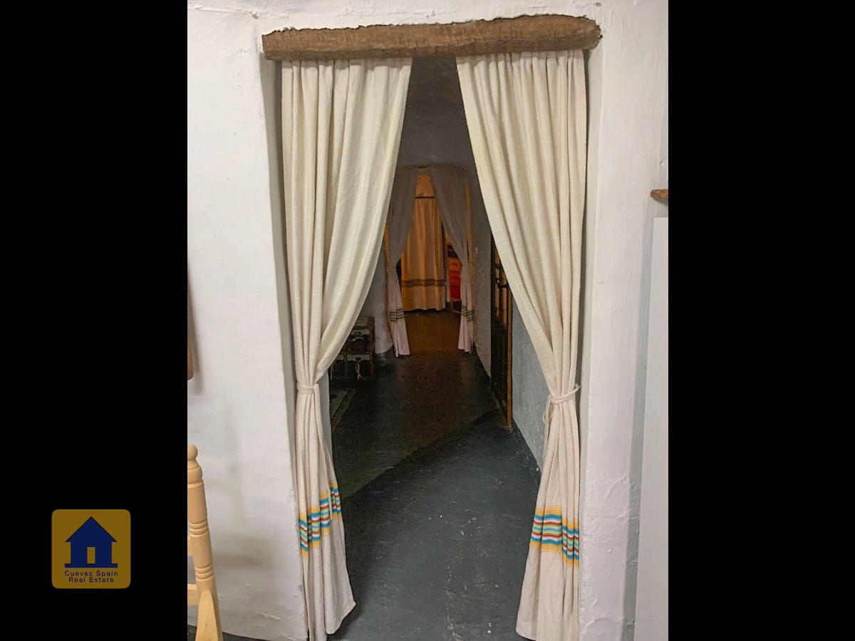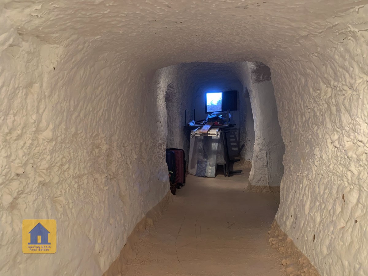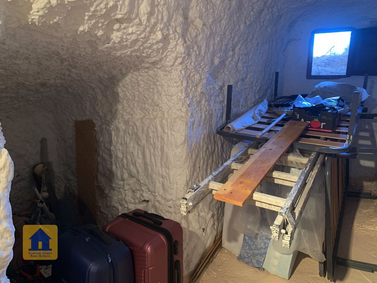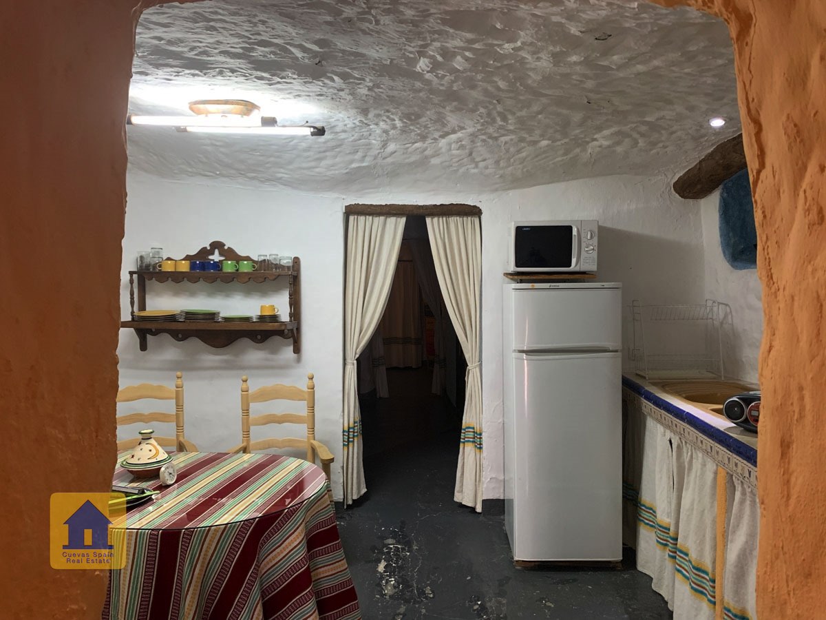 La grotte est magnifiquement authentique. Elle est prête à être emménagée ou à être redécorée pour y apporter votre propre touche. Le hall d'entrée est spacieux, accueillant et pratique. Sur la gauche se trouve le salon avec une pittoresque fenêtre de grotte profonde et d'anciennes mangeoires décoratives. Tout droit se trouve la cuisine/salle à manger traditionnelle espagnole avec une cheminée. De la cuisine, on accède aux chambres. Dans le couloir il y a un espace pour un lit simple, et la salle de bains se trouve juste de l'autre côté du couloir. Au fond de la grotte se trouve une chambre double confortable. À gauche de la cuisine se trouve une chambre double avec un couloir, une longue pièce pouvant servir de rangement, avec une fenêtre donnant sur le l'arrière de la grotte.