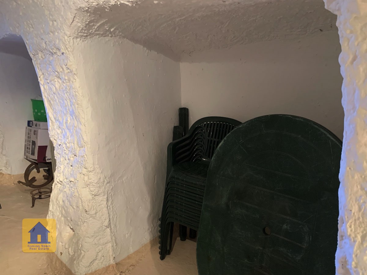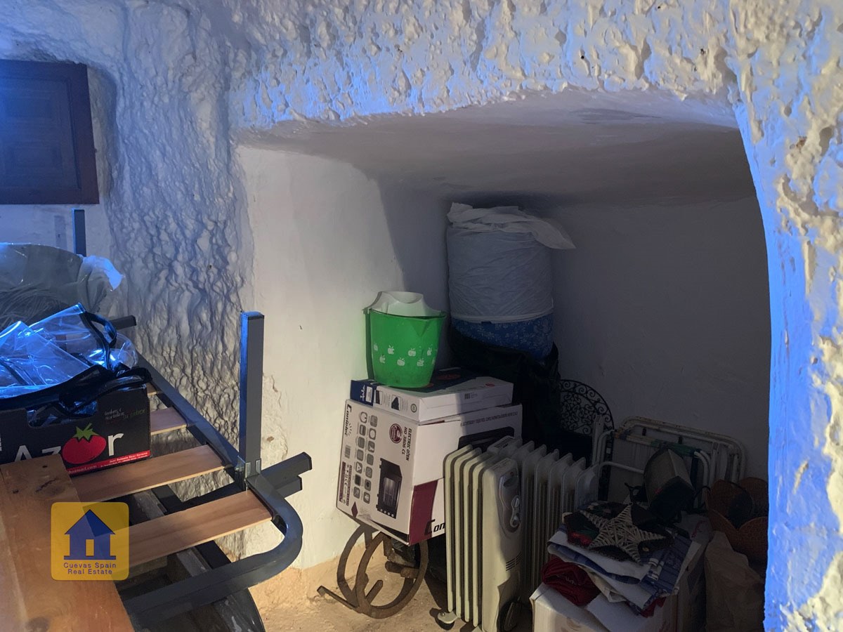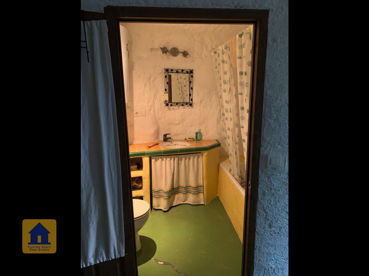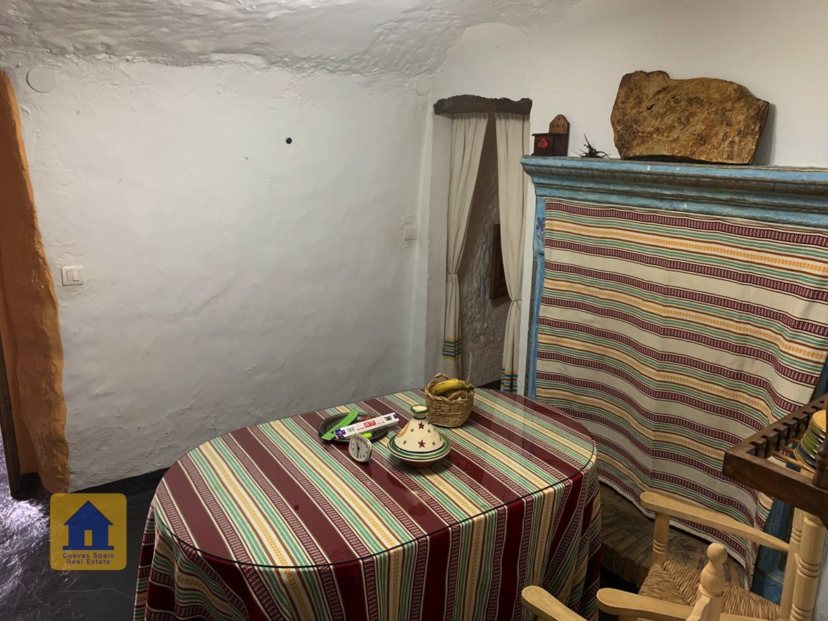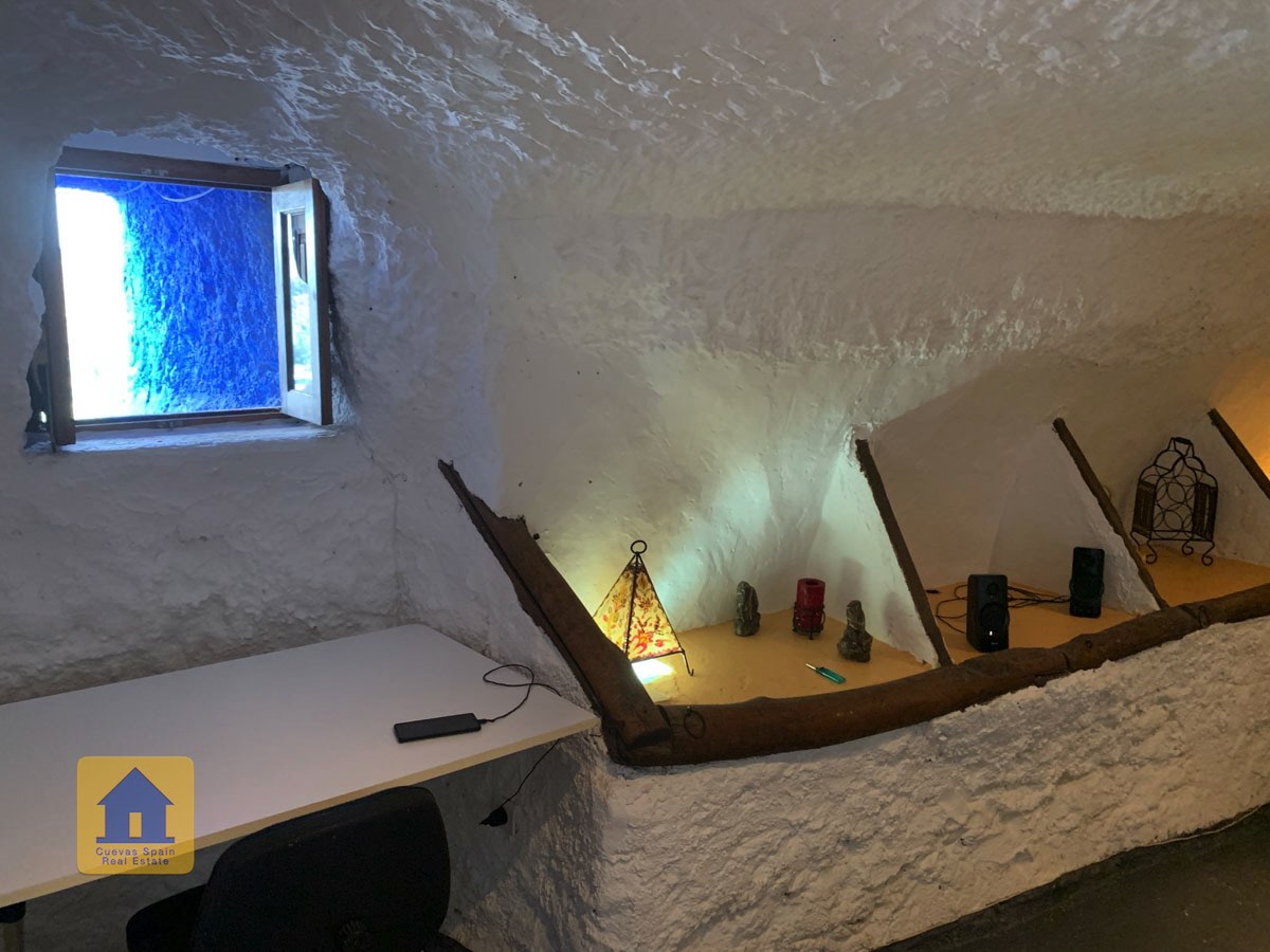 La grotte est magnifiquement authentique. Elle est prête à être emménagée ou à être redécorée pour y apporter votre propre touche. Le hall d'entrée est spacieux, accueillant et pratique. Sur la gauche se trouve le salon avec une pittoresque fenêtre de grotte profonde et d'anciennes mangeoires décoratives. Tout droit se trouve la cuisine/salle à manger traditionnelle espagnole avec une cheminée. De la cuisine, on accède aux chambres. Dans le couloir il y a un espace pour un lit simple, et la salle de bains se trouve juste de l'autre côté du couloir. Au fond de la grotte se trouve une chambre double confortable. À gauche de la cuisine se trouve une chambre double avec un couloir, une longue pièce pouvant servir de rangement, avec une fenêtre donnant sur le l'arrière de la grotte.