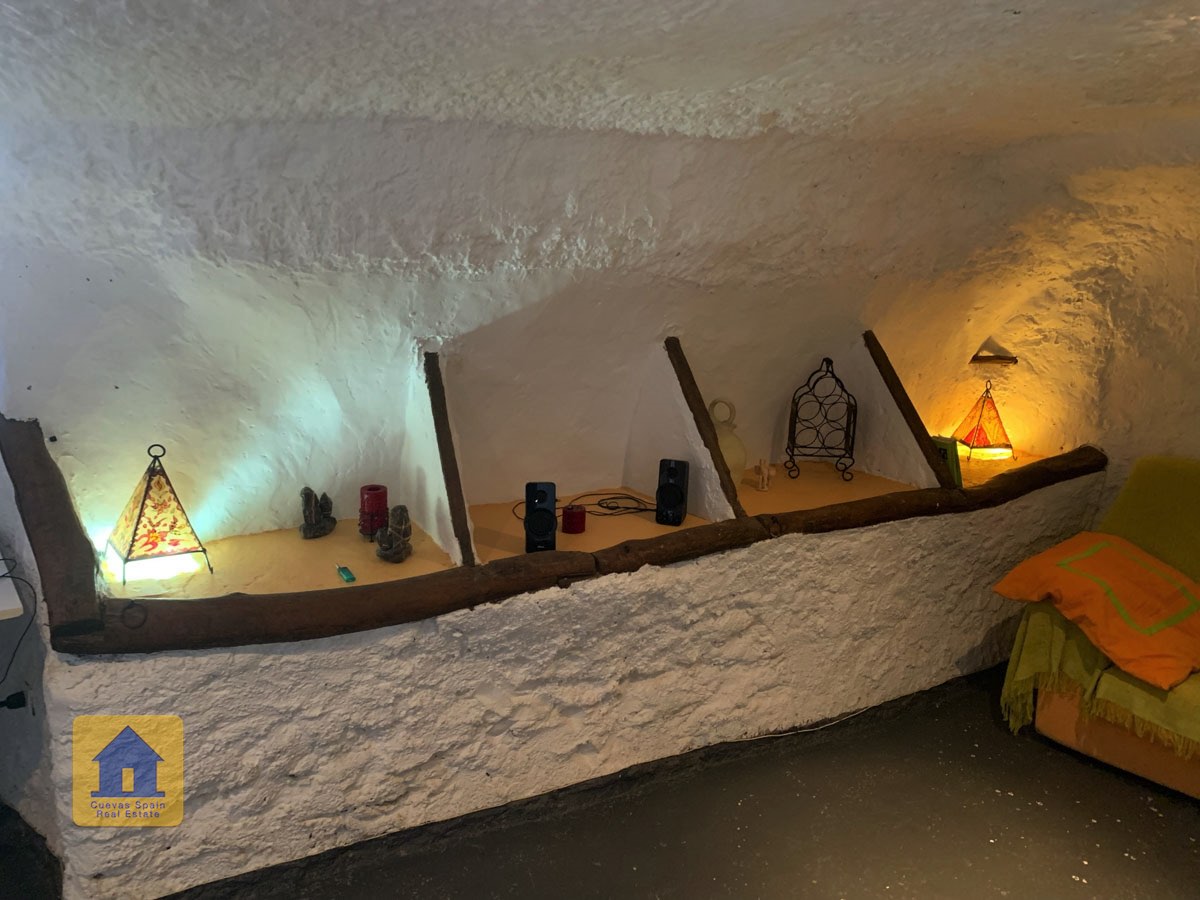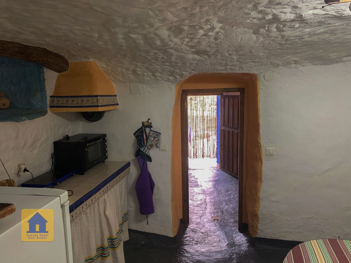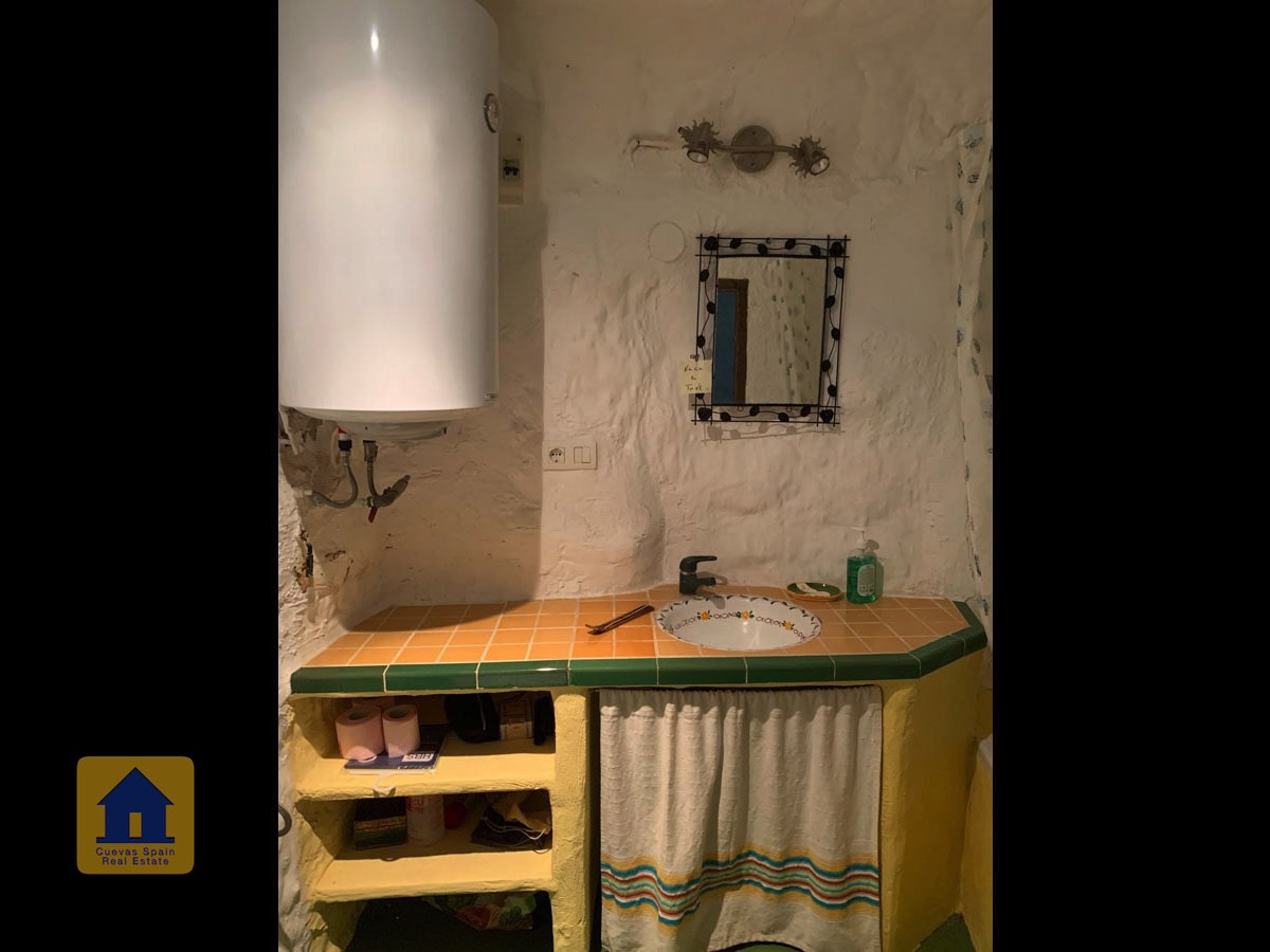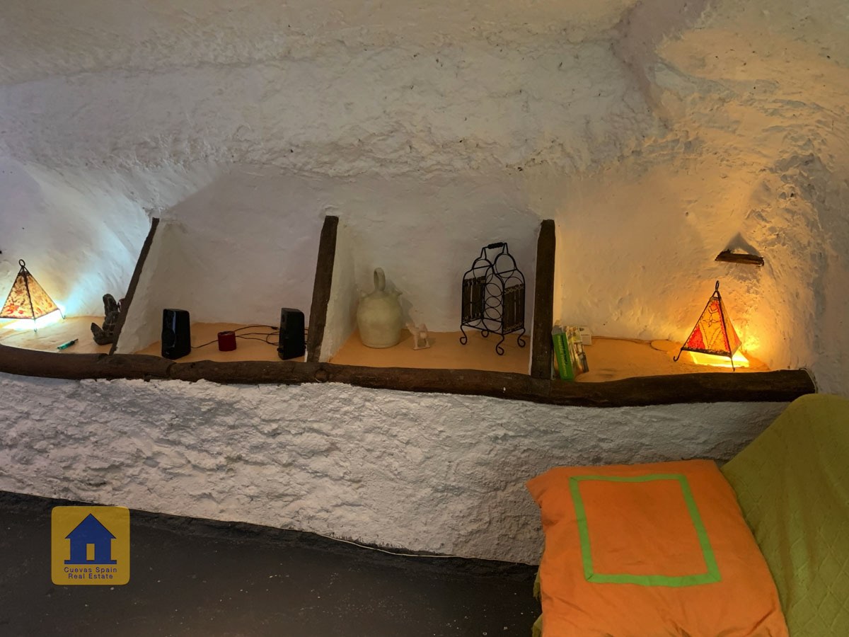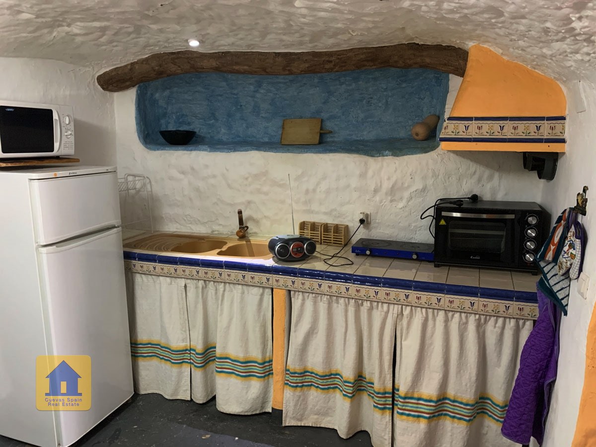 La grotte est magnifiquement authentique. Elle est prête à être emménagée ou à être redécorée pour y apporter votre propre touche. Le hall d'entrée est spacieux, accueillant et pratique. Sur la gauche se trouve le salon avec une pittoresque fenêtre de grotte profonde et d'anciennes mangeoires décoratives. Tout droit se trouve la cuisine/salle à manger traditionnelle espagnole avec une cheminée. De la cuisine, on accède aux chambres. Dans le couloir il y a un espace pour un lit simple, et la salle de bains se trouve juste de l'autre côté du couloir. Au fond de la grotte se trouve une chambre double confortable. À gauche de la cuisine se trouve une chambre double avec un couloir, une longue pièce pouvant servir de rangement, avec une fenêtre donnant sur le l'arrière de la grotte.