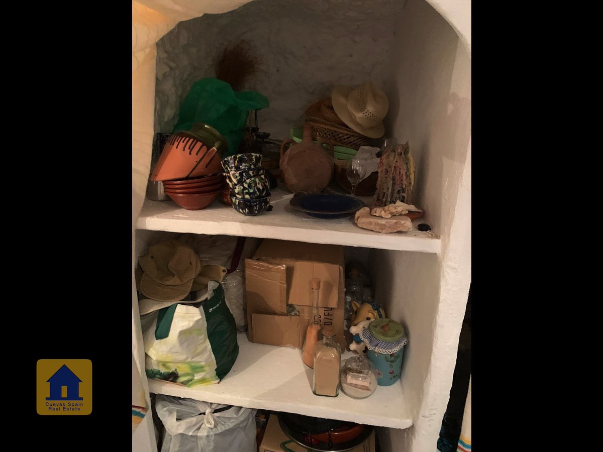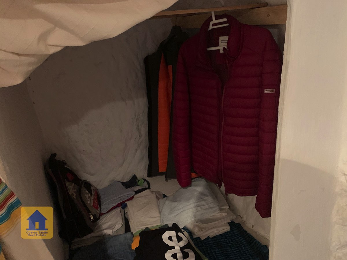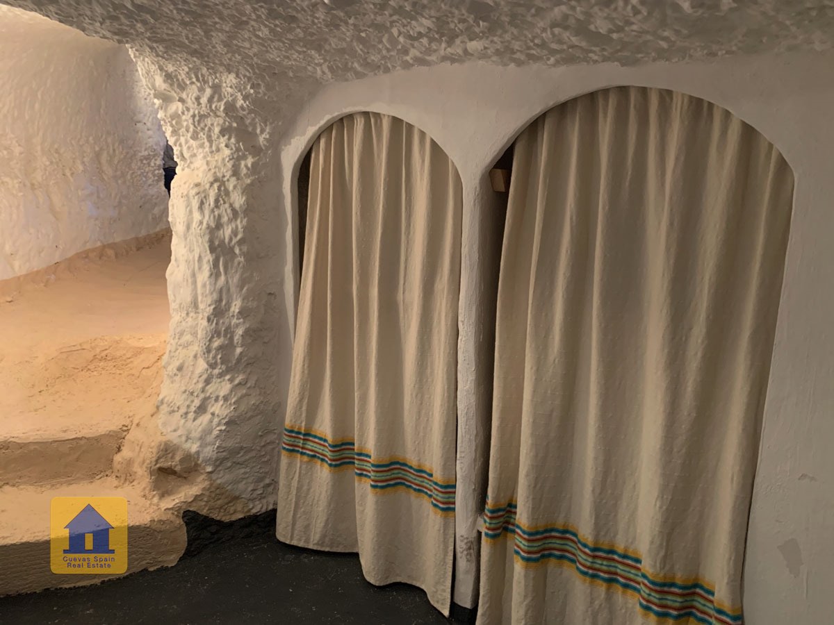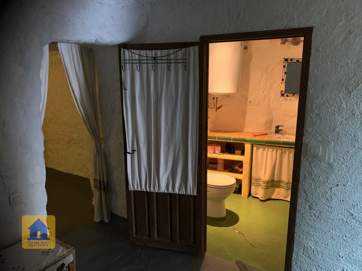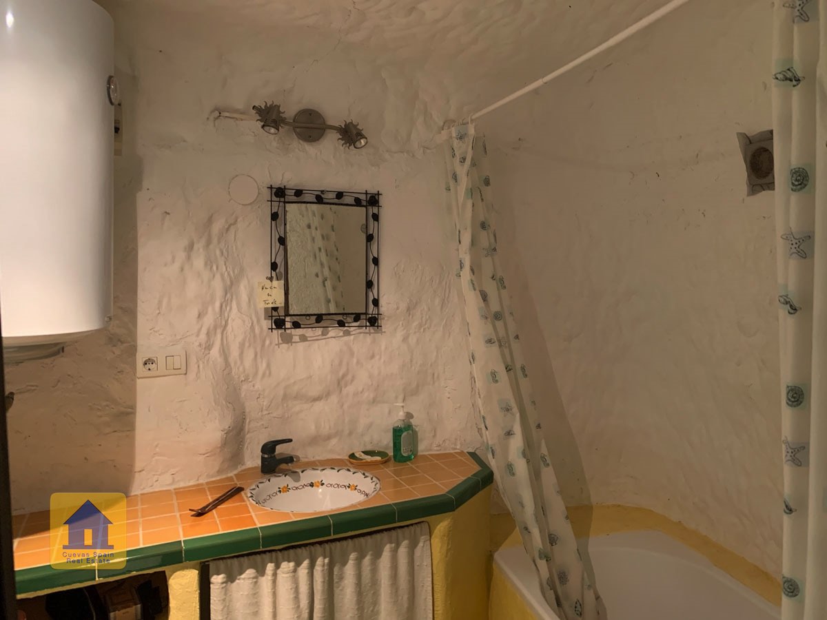 La grotte est magnifiquement authentique. Elle est prête à être emménagée ou à être redécorée pour y apporter votre propre touche. Le hall d'entrée est spacieux, accueillant et pratique. Sur la gauche se trouve le salon avec une pittoresque fenêtre de grotte profonde et d'anciennes mangeoires décoratives. Tout droit se trouve la cuisine/salle à manger traditionnelle espagnole avec une cheminée. De la cuisine, on accède aux chambres. Dans le couloir il y a un espace pour un lit simple, et la salle de bains se trouve juste de l'autre côté du couloir. Au fond de la grotte se trouve une chambre double confortable. À gauche de la cuisine se trouve une chambre double avec un couloir, une longue pièce pouvant servir de rangement, avec une fenêtre donnant sur le l'arrière de la grotte.