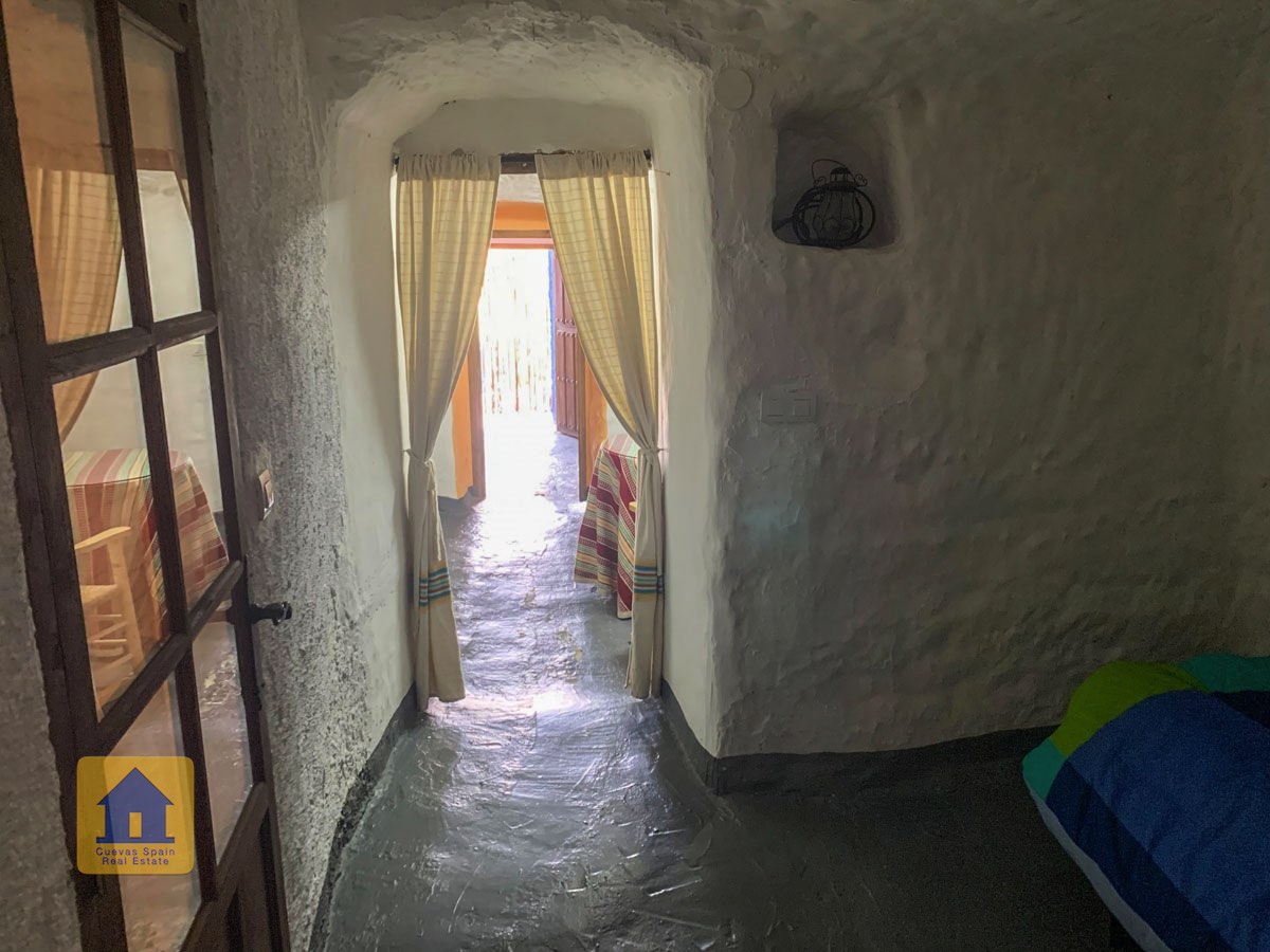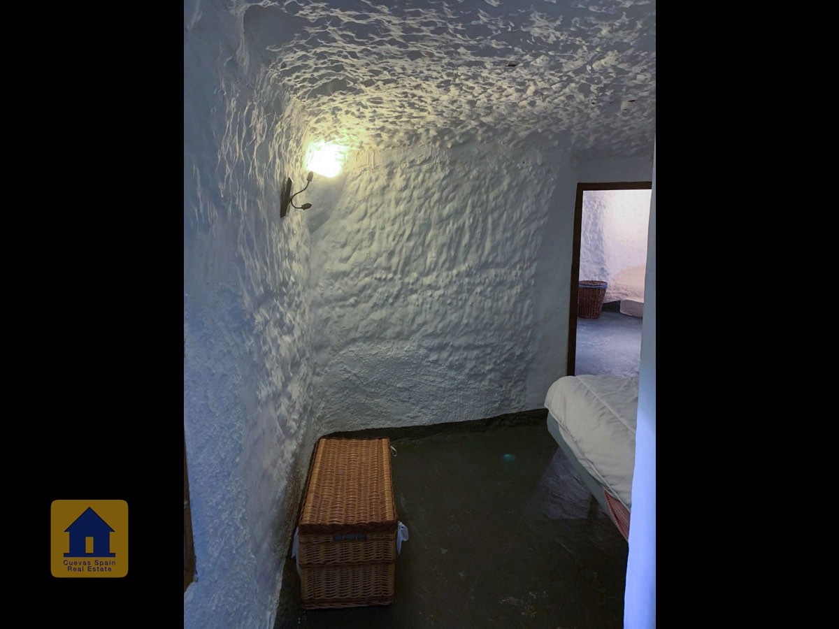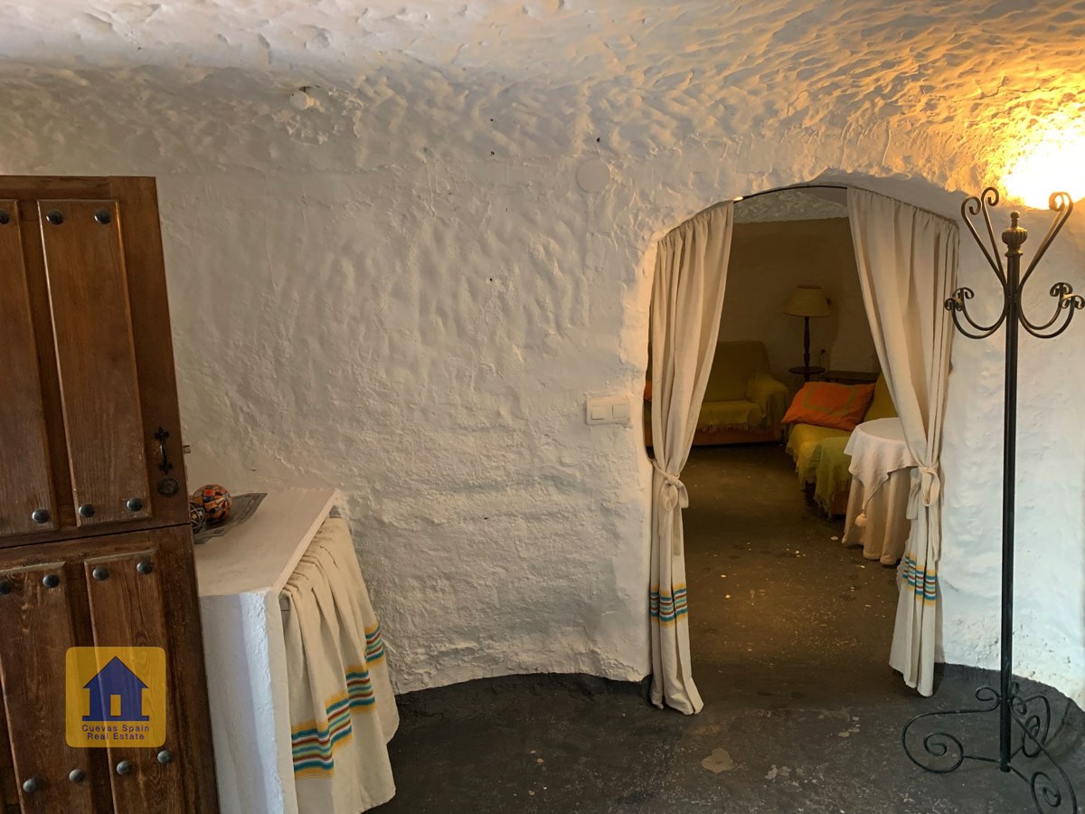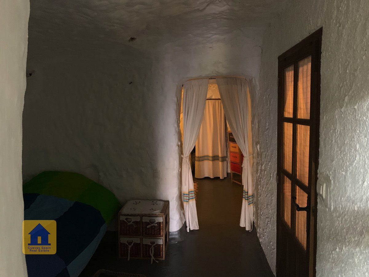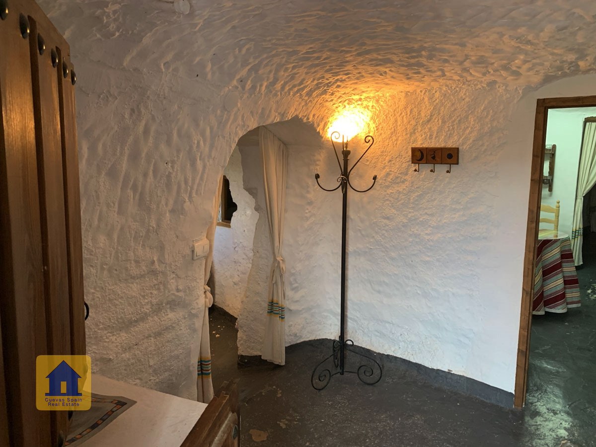 La cueva es muy auténtica. Está lista para entrar a vivir o actualizarla para darle su propio toque. Hay un amplio recibidor, acogedor y práctico. A la izquierda está el salón con una pintoresca ventana profunda de la cueva y antiguos comederos decorativos para animales. Más adelante está la cocina/comedor tradicional con chimenea. Desde la cocina se pasa a los dormitorios. Al fondo del pasillo hay un «cubículo» para una cama individual, con el cuarto de baño al otro lado del pasillo. Al fondo de la cueva hay un acogedor dormitorio doble. A la izquierda de la cocina hay un dormitorio doble con un pasillo/guardarropa/trastero que tiene una ventana que da al lateral de la cueva.