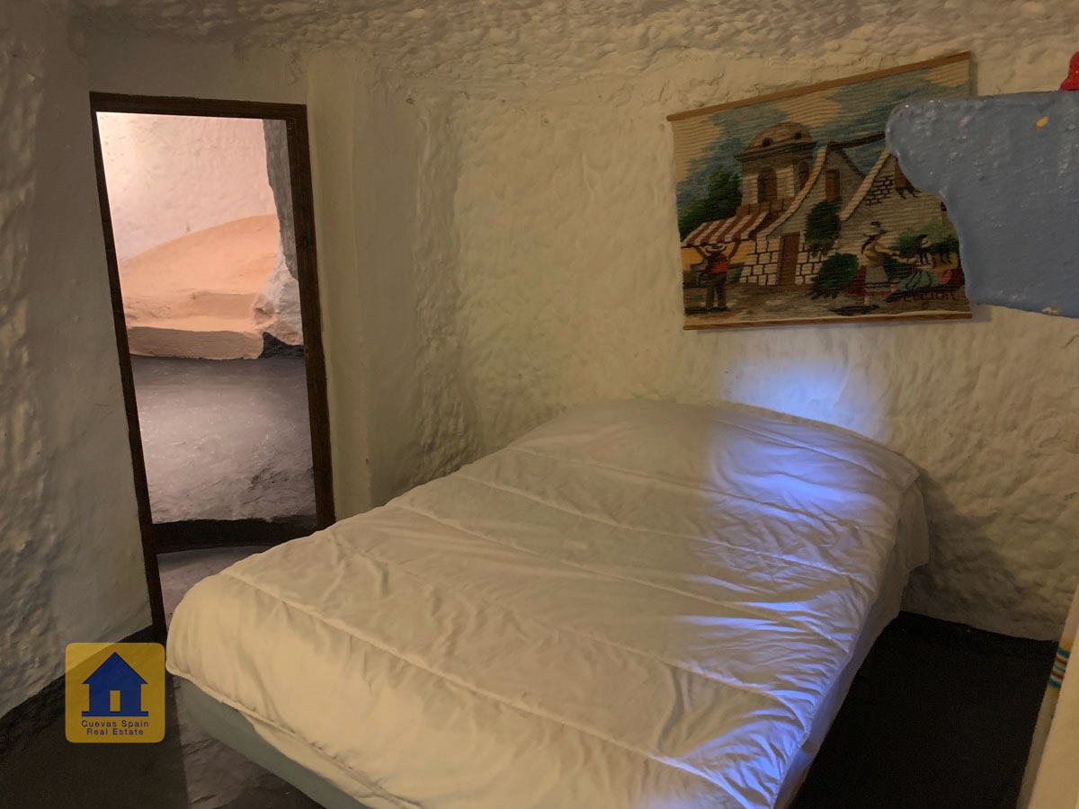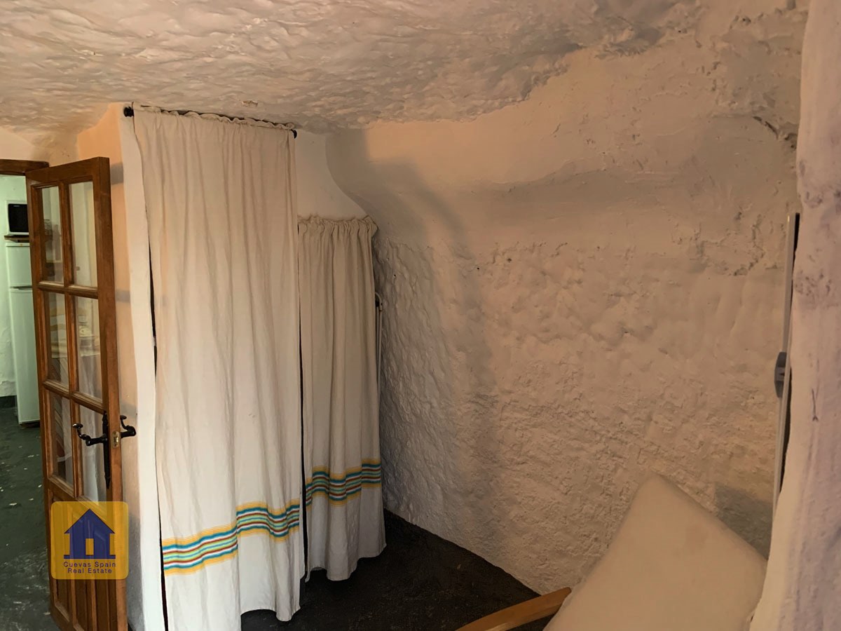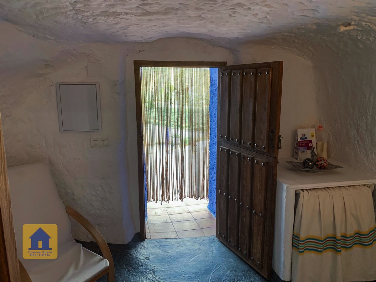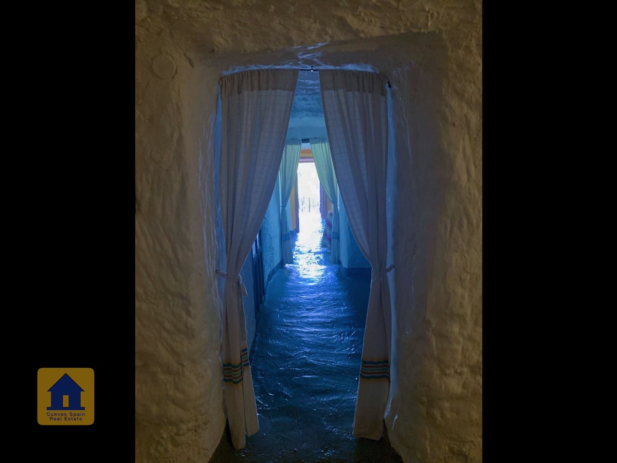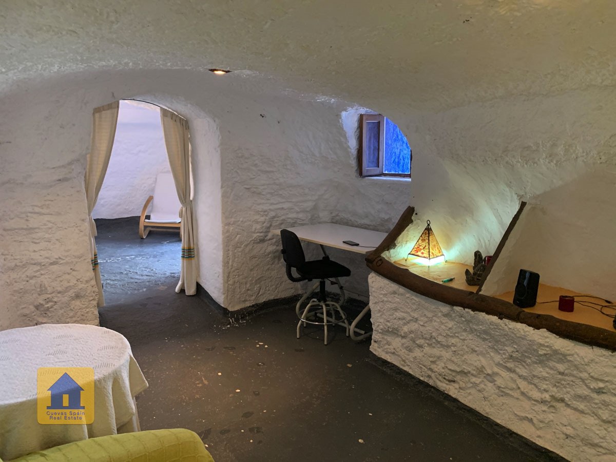 La cueva es muy auténtica. Está lista para entrar a vivir o actualizarla para darle su propio toque. Hay un amplio recibidor, acogedor y práctico. A la izquierda está el salón con una pintoresca ventana profunda de la cueva y antiguos comederos decorativos para animales. Más adelante está la cocina/comedor tradicional con chimenea. Desde la cocina se pasa a los dormitorios. Al fondo del pasillo hay un «cubículo» para una cama individual, con el cuarto de baño al otro lado del pasillo. Al fondo de la cueva hay un acogedor dormitorio doble. A la izquierda de la cocina hay un dormitorio doble con un pasillo/guardarropa/trastero que tiene una ventana que da al lateral de la cueva.