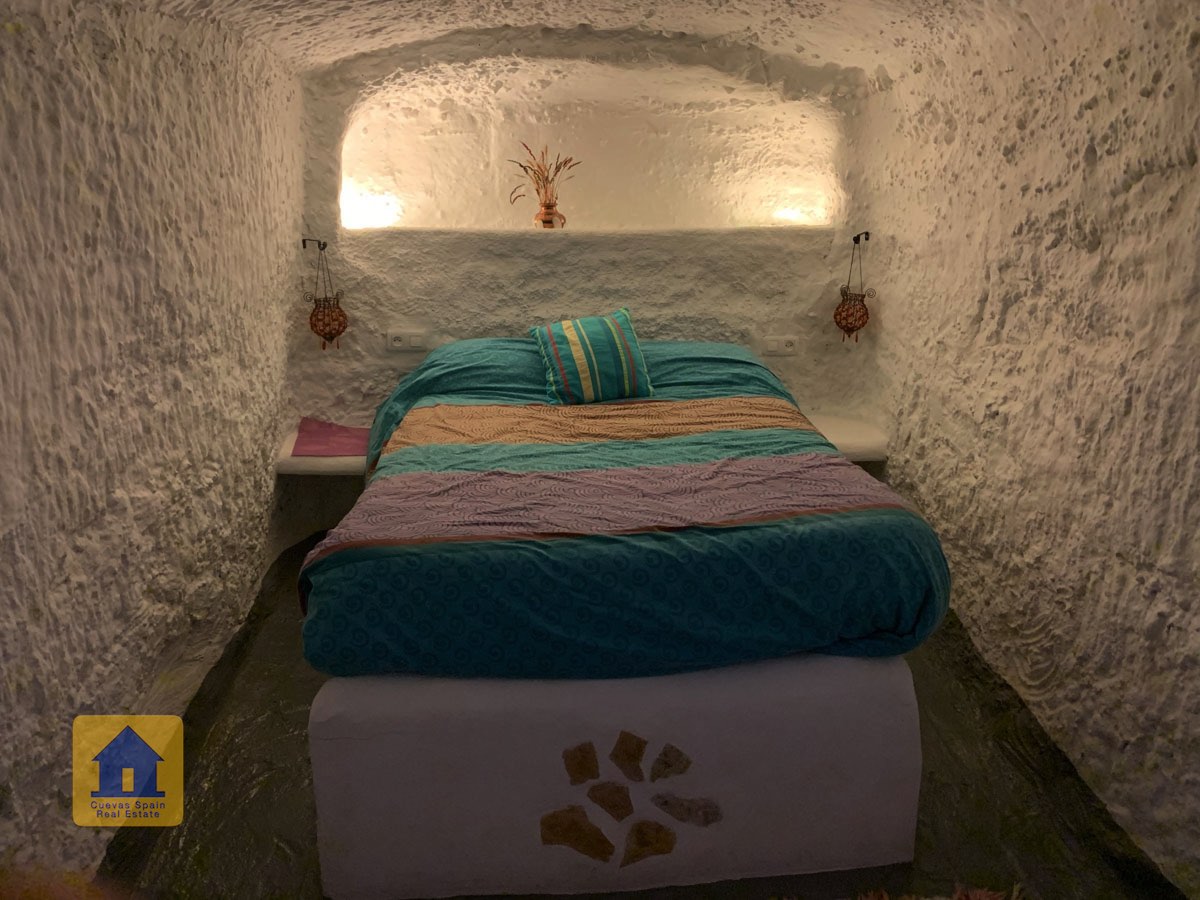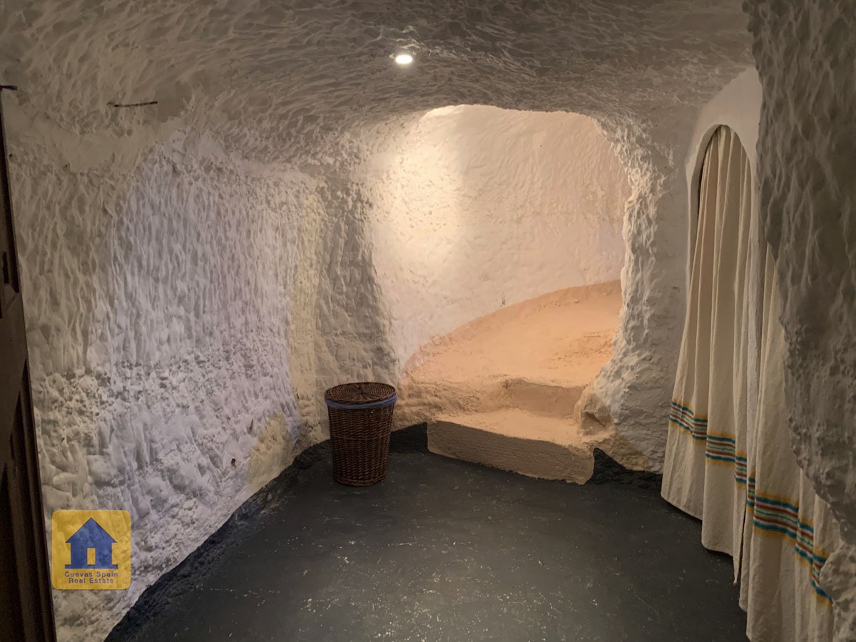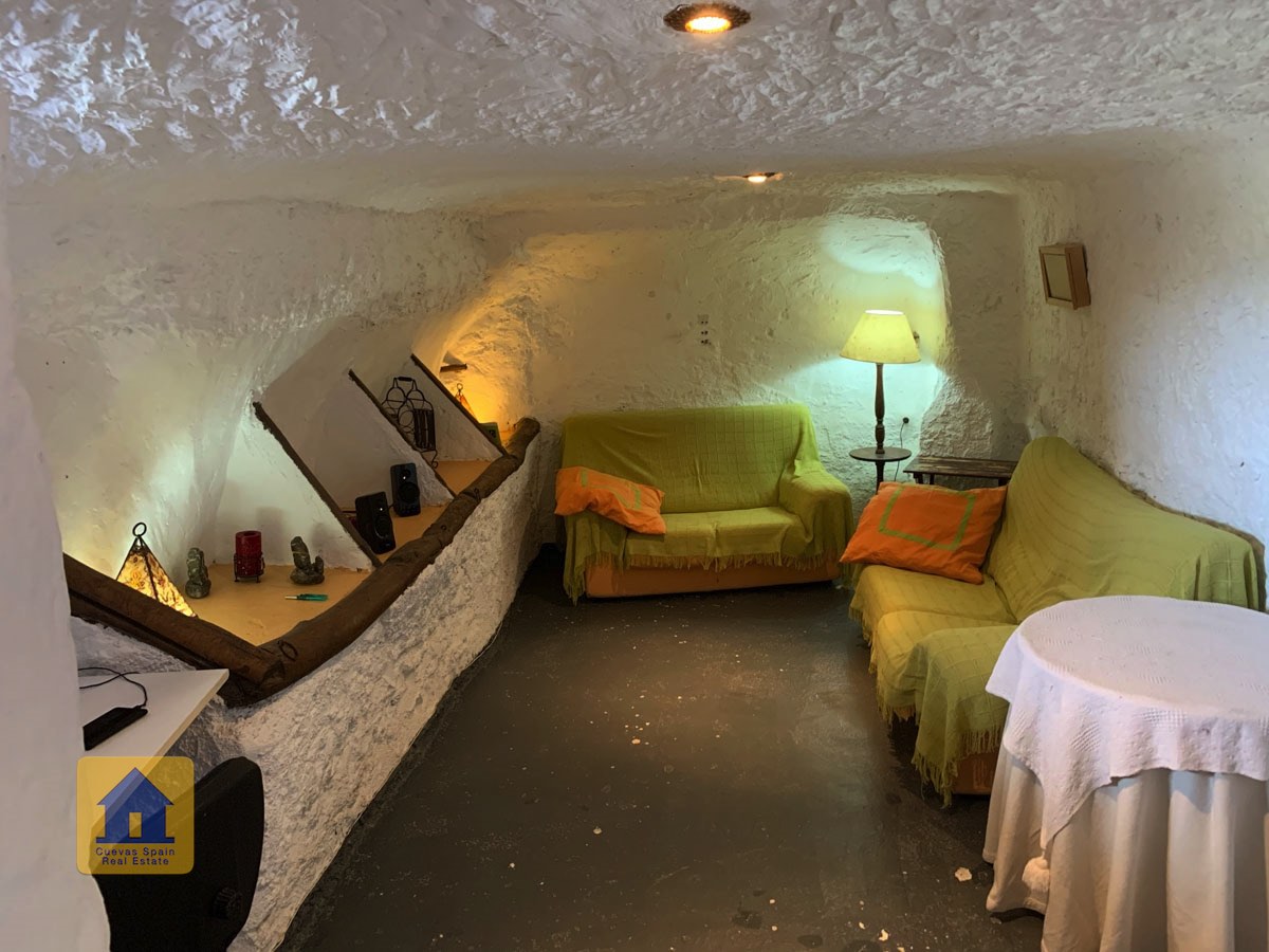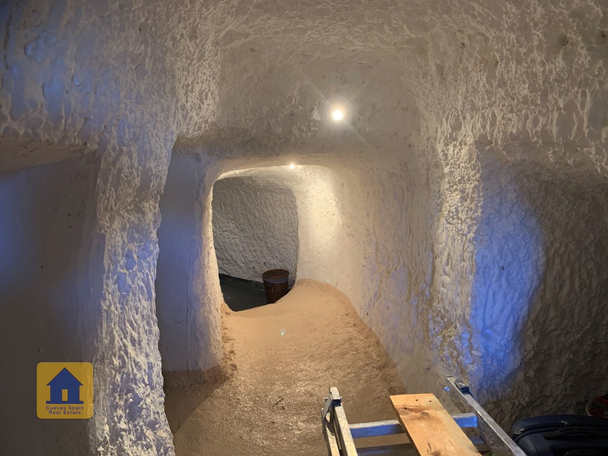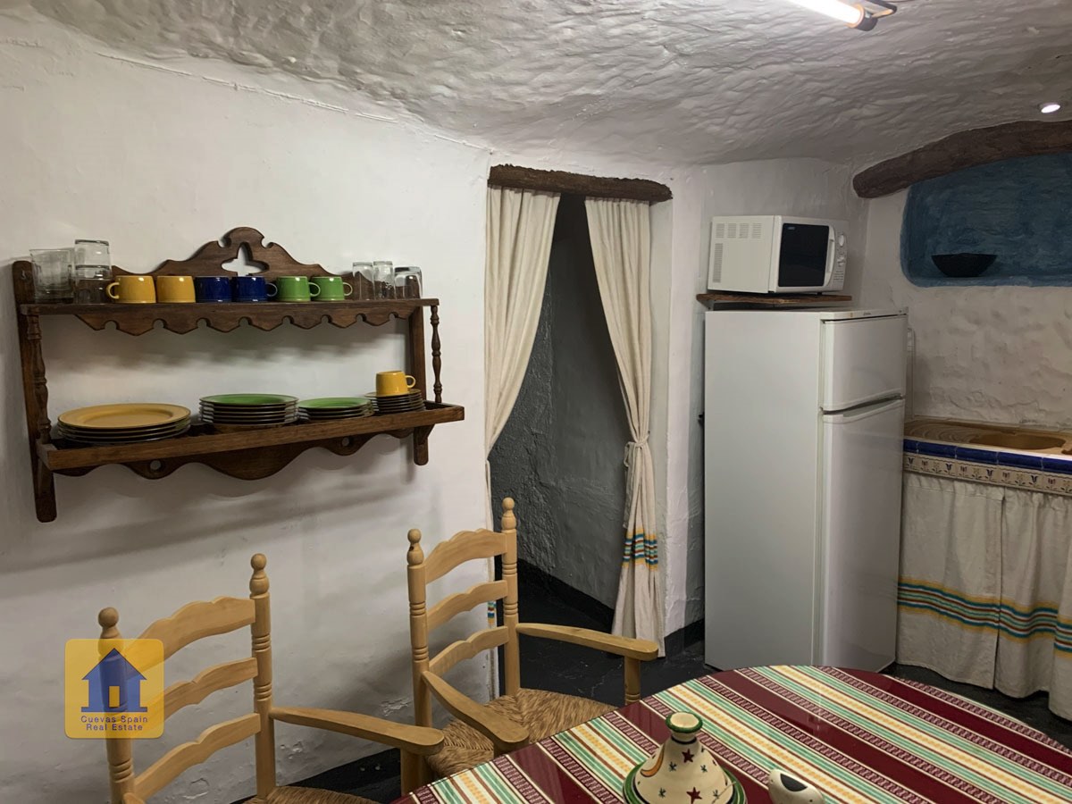 La cueva es muy auténtica. Está lista para entrar a vivir o actualizarla para darle su propio toque. Hay un amplio recibidor, acogedor y práctico. A la izquierda está el salón con una pintoresca ventana profunda de la cueva y antiguos comederos decorativos para animales. Más adelante está la cocina/comedor tradicional con chimenea. Desde la cocina se pasa a los dormitorios. Al fondo del pasillo hay un «cubículo» para una cama individual, con el cuarto de baño al otro lado del pasillo. Al fondo de la cueva hay un acogedor dormitorio doble. A la izquierda de la cocina hay un dormitorio doble con un pasillo/guardarropa/trastero que tiene una ventana que da al lateral de la cueva.