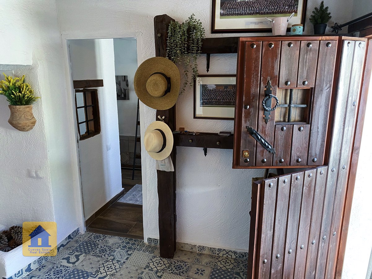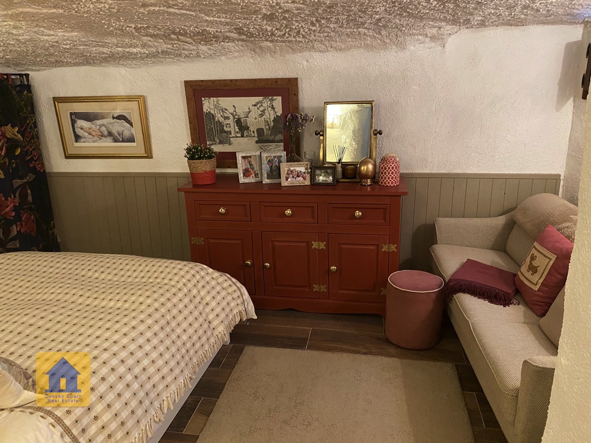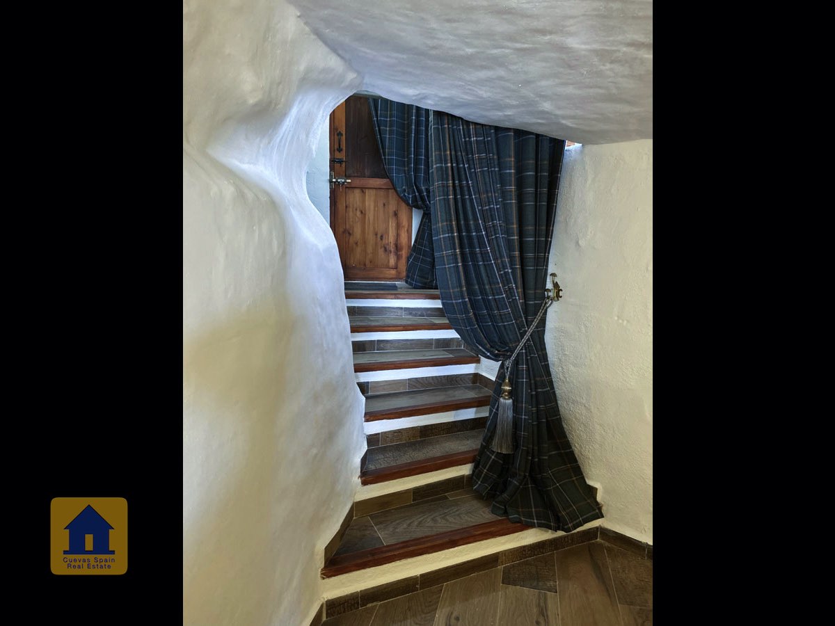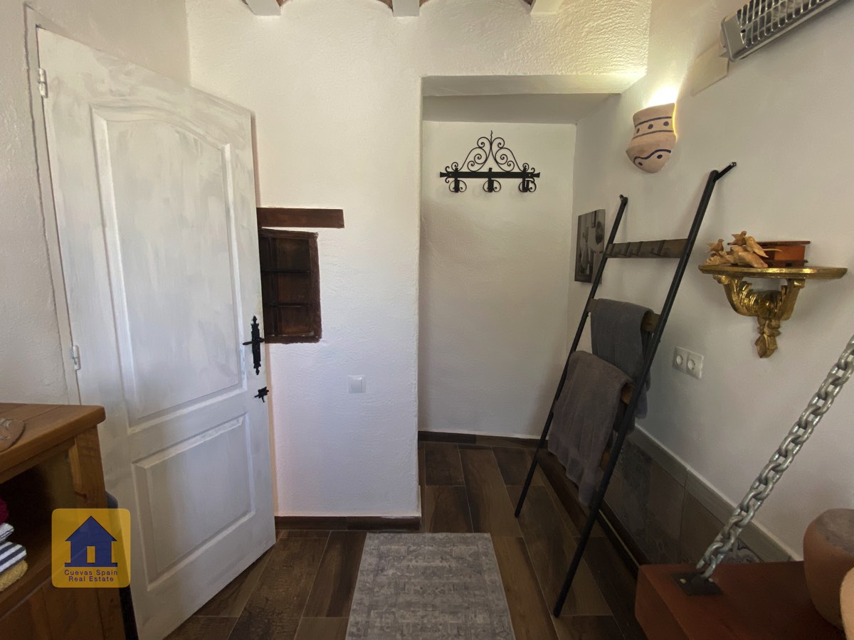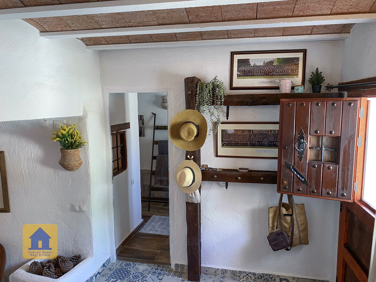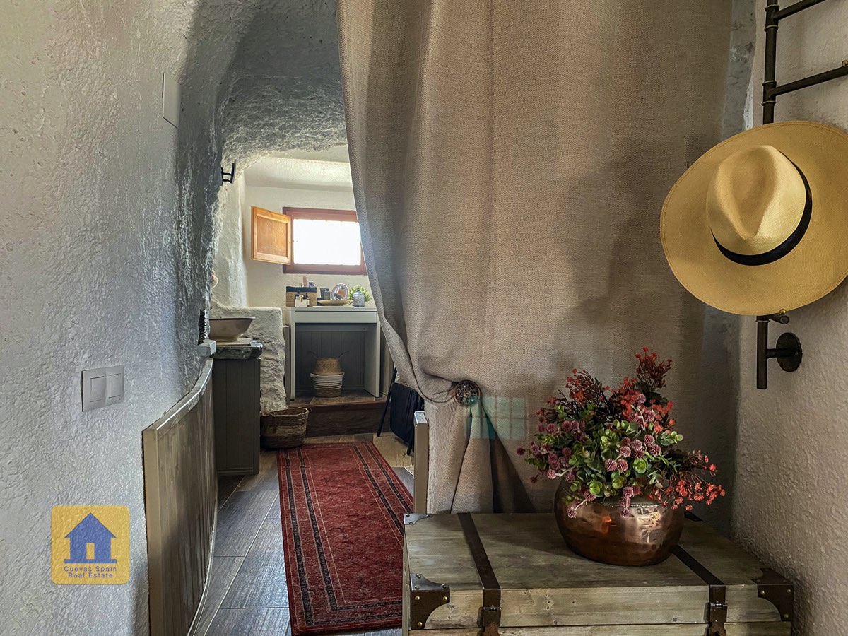 Depuis l'entrée, par des portes de grange coulissantes, on accède à la salle à manger troglodyte, avec une jolie chambre double troglodyte à droite. On traverse la salle à manger pour accéder à l'entrée arrière avec des placards de rangement à gauche et un coin buanderie à droite. Vous accédez ensuite par la porte arrière à la terrasse fermée avec bancs intégrés, placard de rangement et rangement pour le bois, offrant une vue dégagée, idéale pour se détendre et admirer les couchers de soleil. La route sinueuse qui longe la propriété est principalement piétonne. C'est un lieu magnifique propice à la paix et à la contemplation.