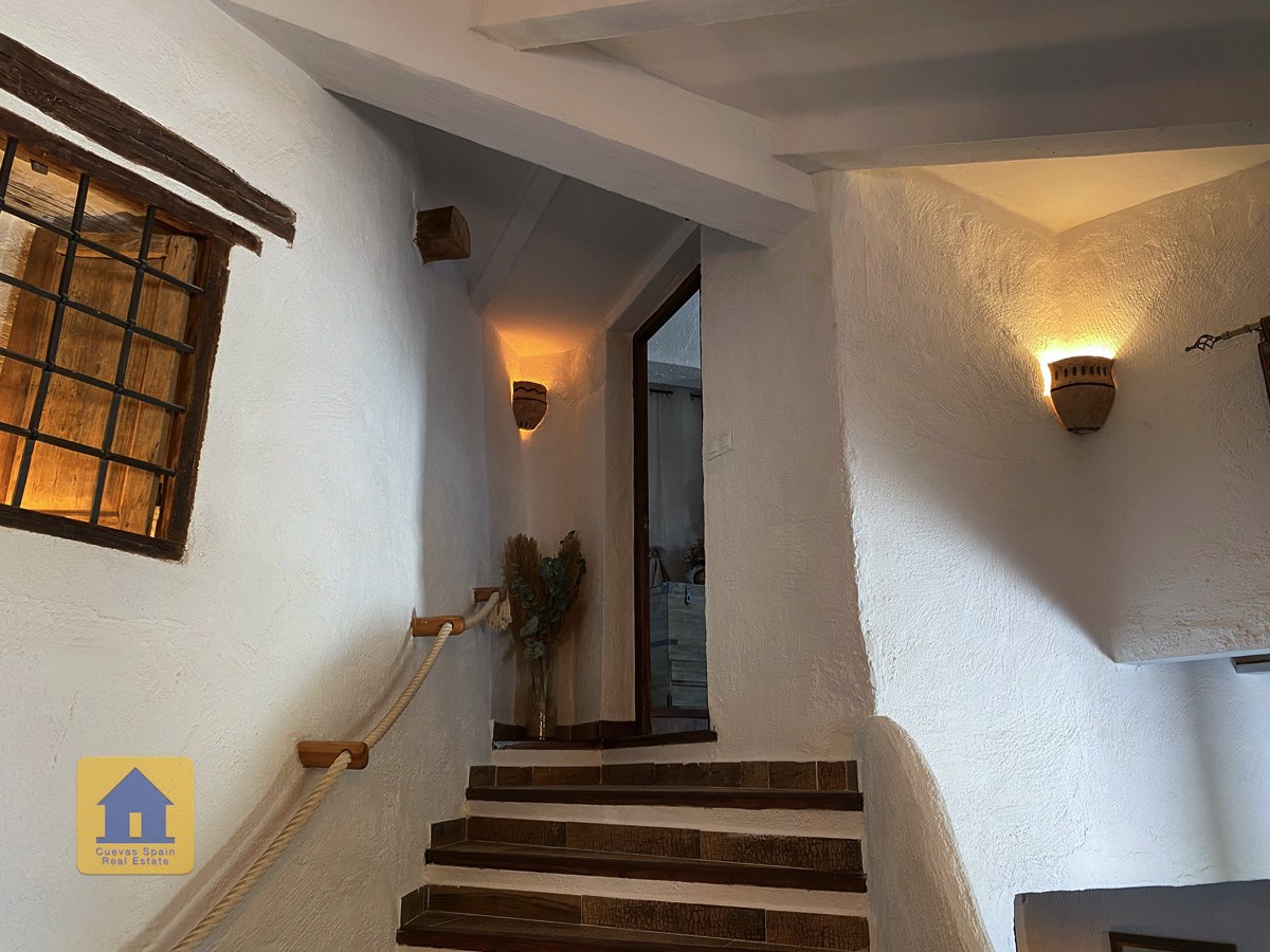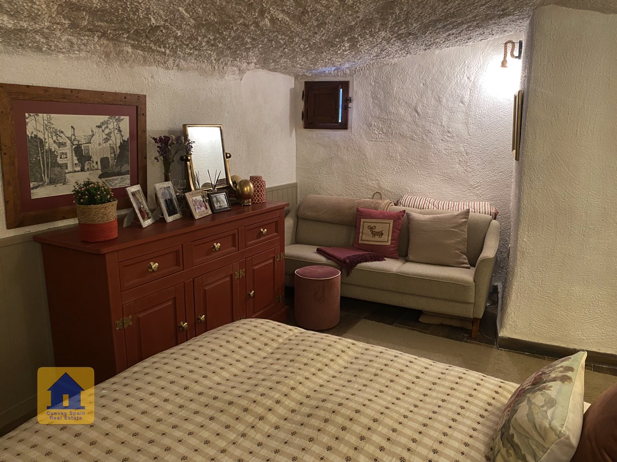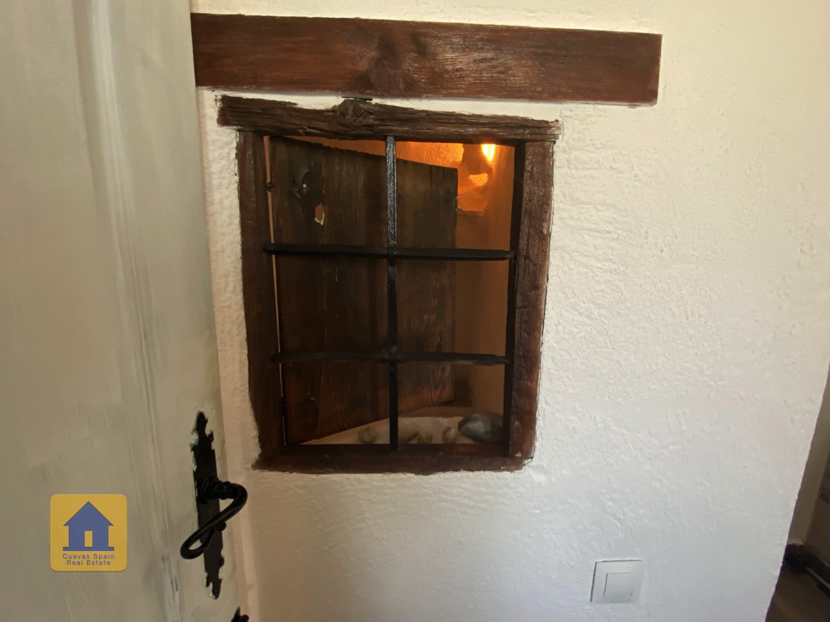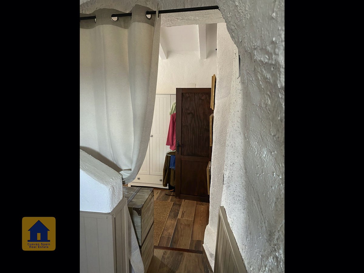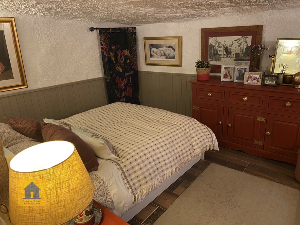 Depuis l'entrée, par des portes de grange coulissantes, on accède à la salle à manger troglodyte, avec une jolie chambre double troglodyte à droite. On traverse la salle à manger pour accéder à l'entrée arrière avec des placards de rangement à gauche et un coin buanderie à droite. Vous accédez ensuite par la porte arrière à la terrasse fermée avec bancs intégrés, placard de rangement et rangement pour le bois, offrant une vue dégagée, idéale pour se détendre et admirer les couchers de soleil. La route sinueuse qui longe la propriété est principalement piétonne. C'est un lieu magnifique propice à la paix et à la contemplation.