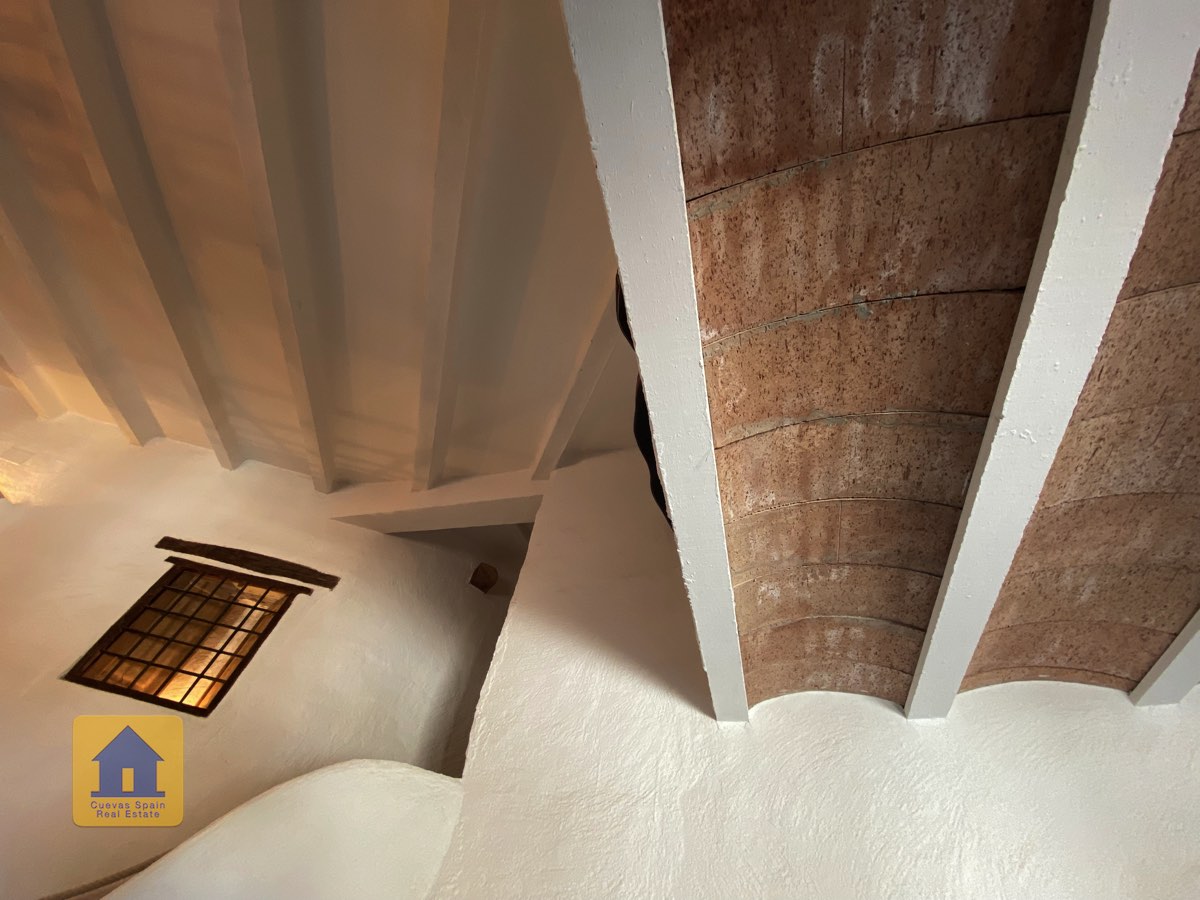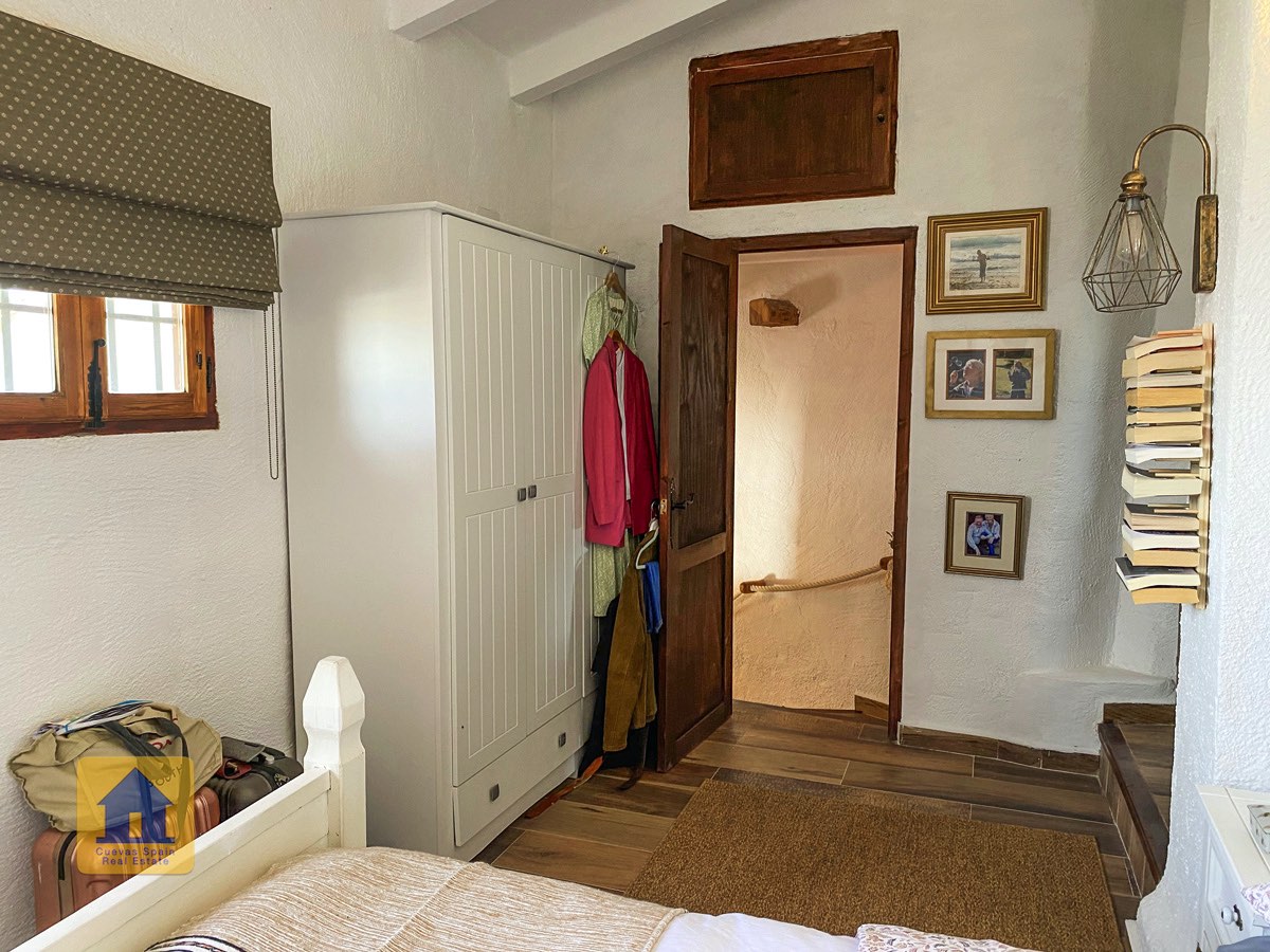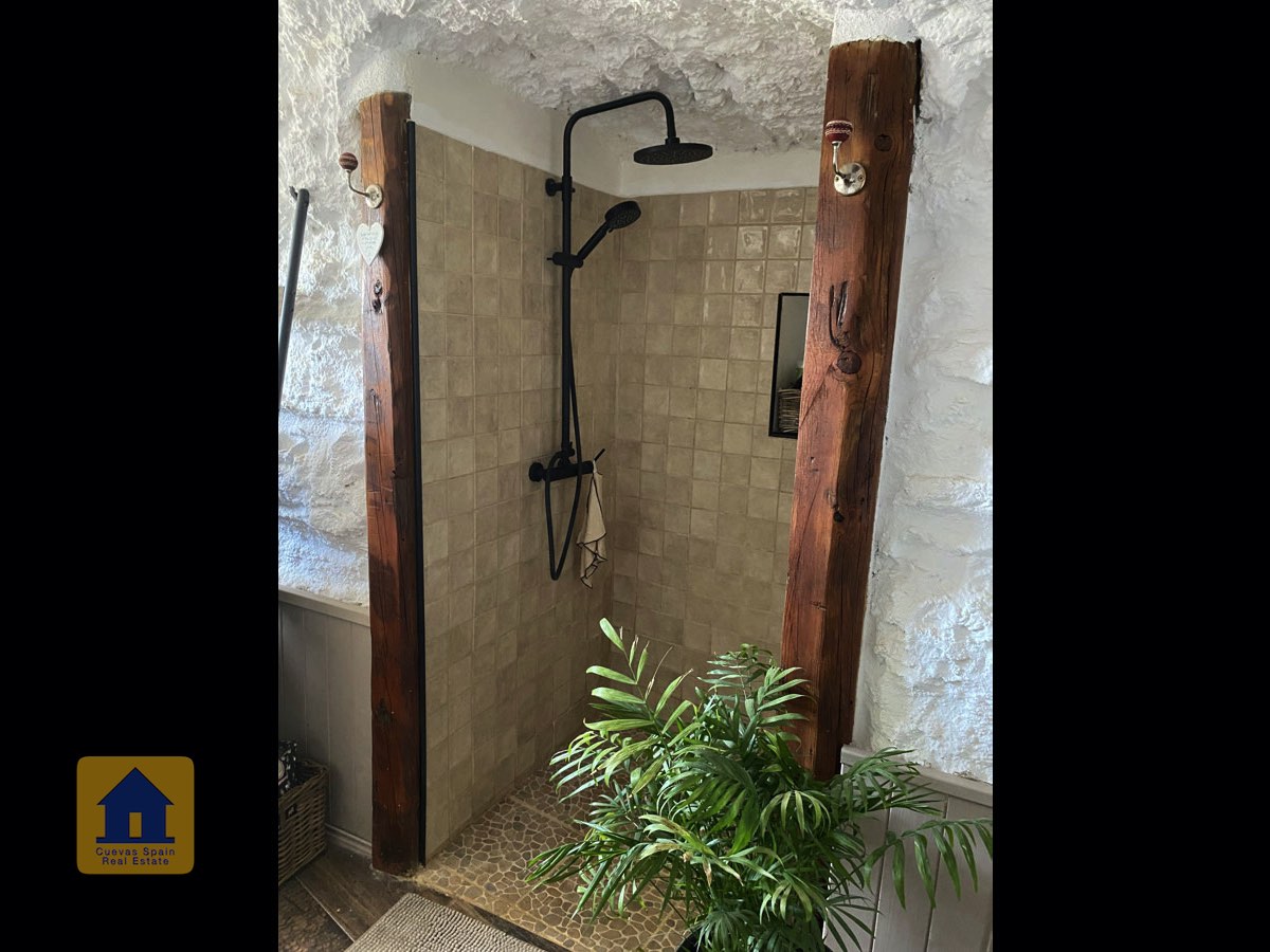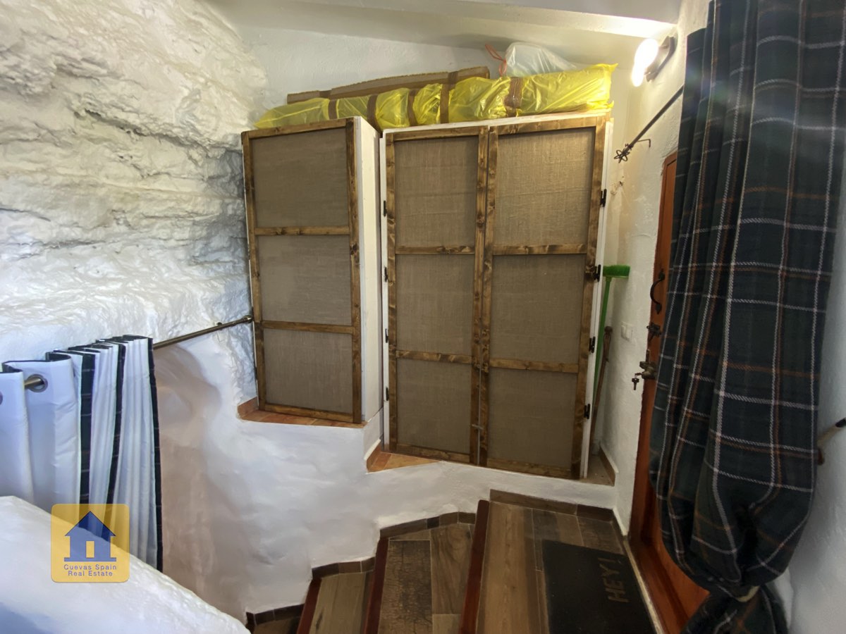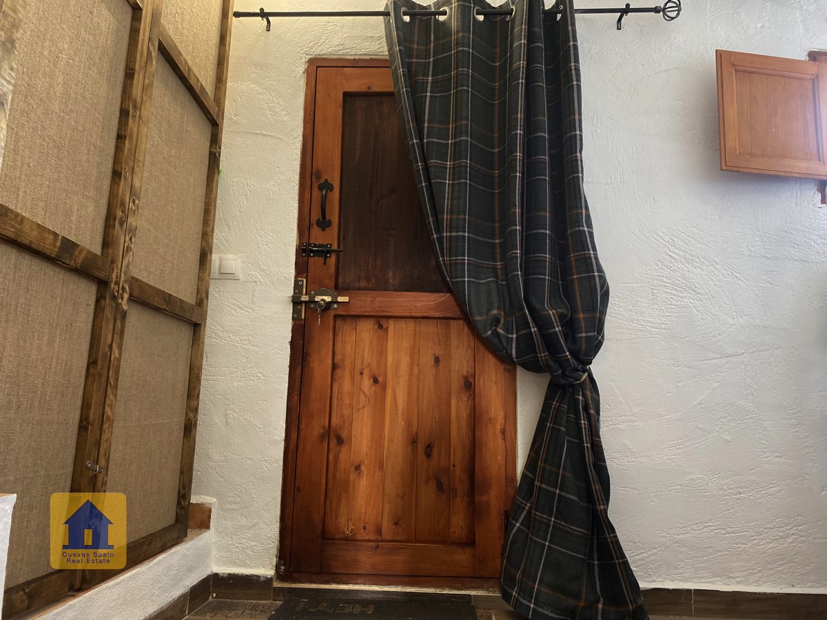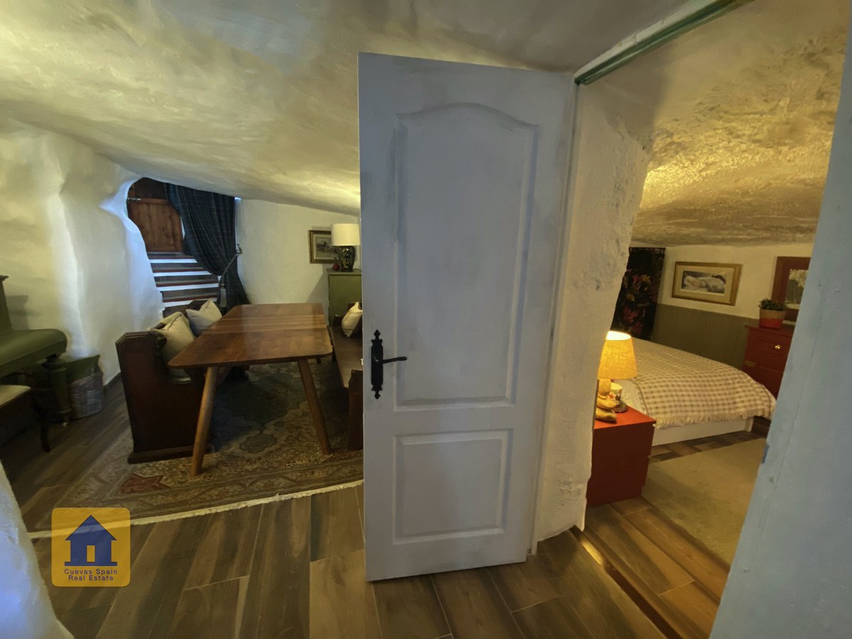 Depuis l'entrée, par des portes de grange coulissantes, on accède à la salle à manger troglodyte, avec une jolie chambre double troglodyte à droite. On traverse la salle à manger pour accéder à l'entrée arrière avec des placards de rangement à gauche et un coin buanderie à droite. Vous accédez ensuite par la porte arrière à la terrasse fermée avec bancs intégrés, placard de rangement et rangement pour le bois, offrant une vue dégagée, idéale pour se détendre et admirer les couchers de soleil. La route sinueuse qui longe la propriété est principalement piétonne. C'est un lieu magnifique propice à la paix et à la contemplation.