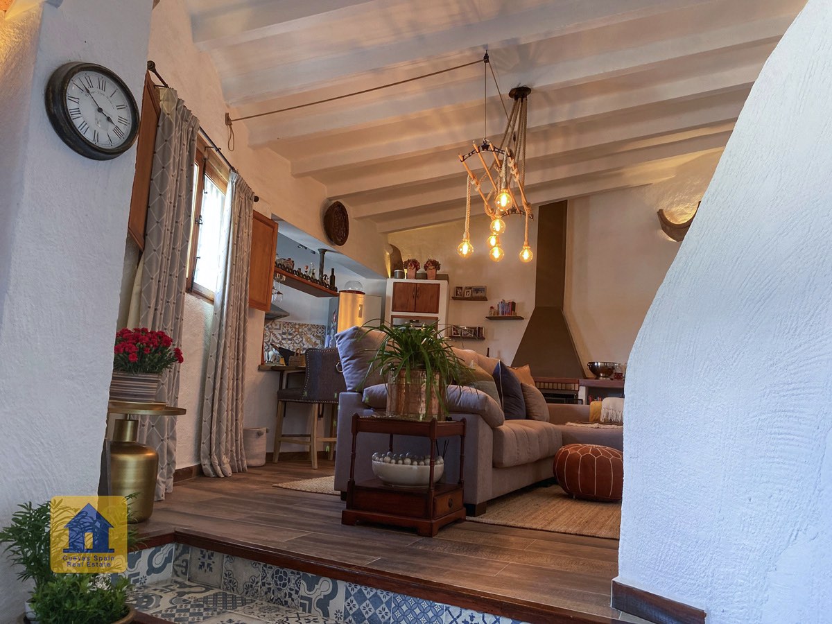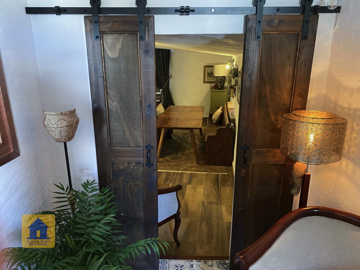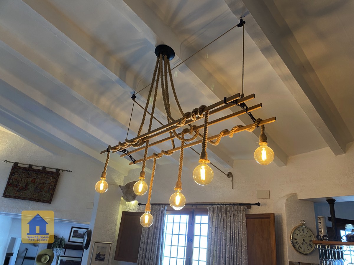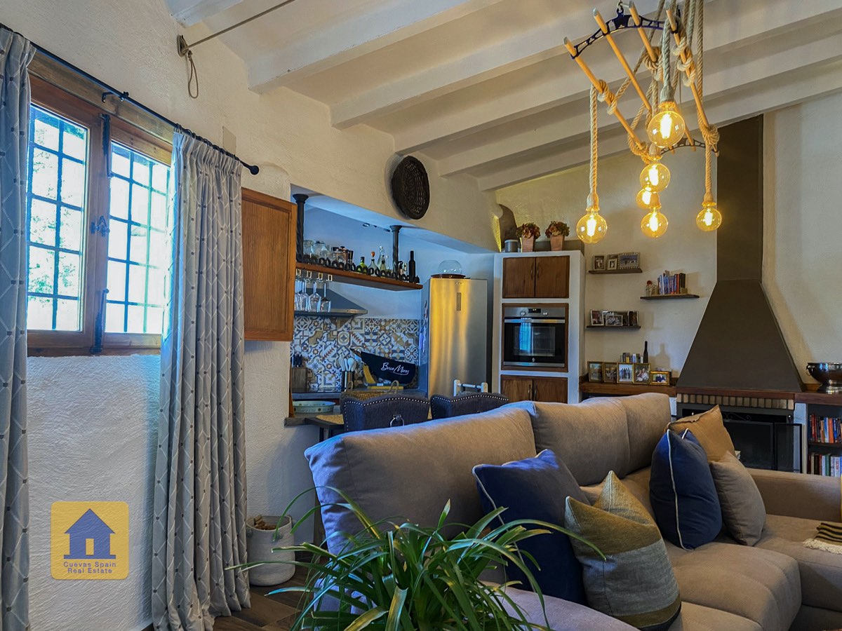 L'entrée lumineuse et accueillante est dotée d'une porte de grange traditionnelle en bois. À droite se trouve une salle de bain complète avec douche. À gauche se trouve un impressionnant salon spacieux avec des plafonds d'environ 2,5 à 4 mètres, une cheminée en acier et une cuisine sur mesure, conçue avec goût. Le luminaire suspendu est vendu avec la propriété. Une fenêtre troglodyte intérieure a été conservée et rétroéclairée.