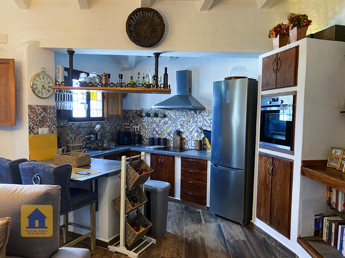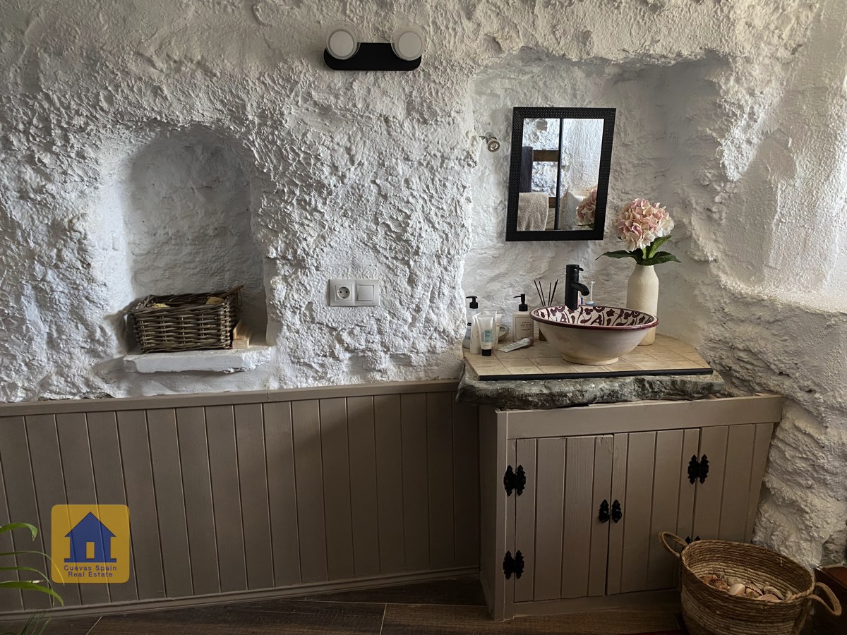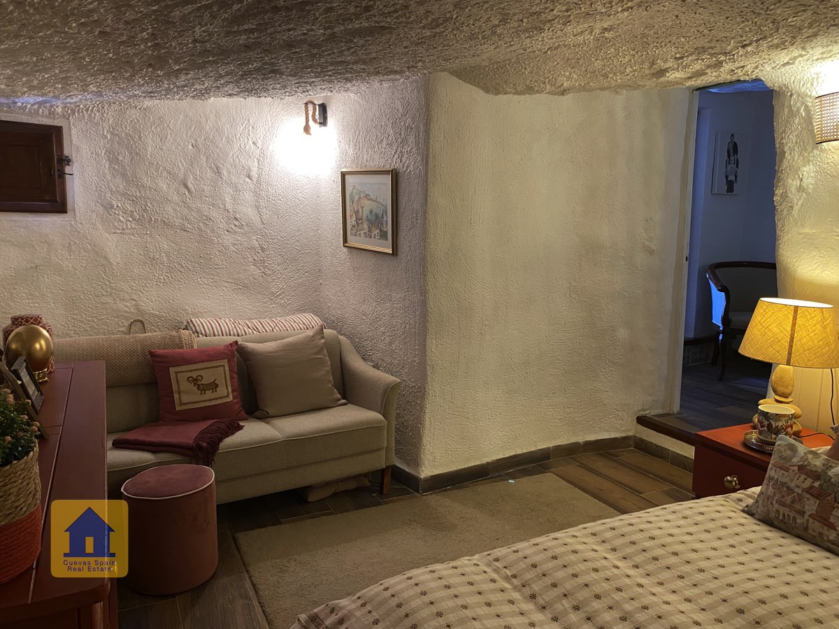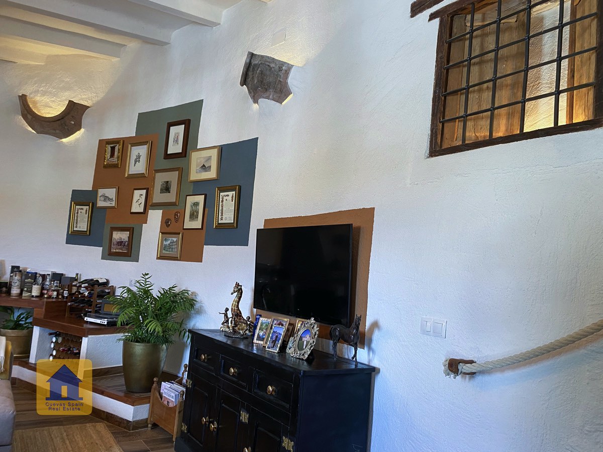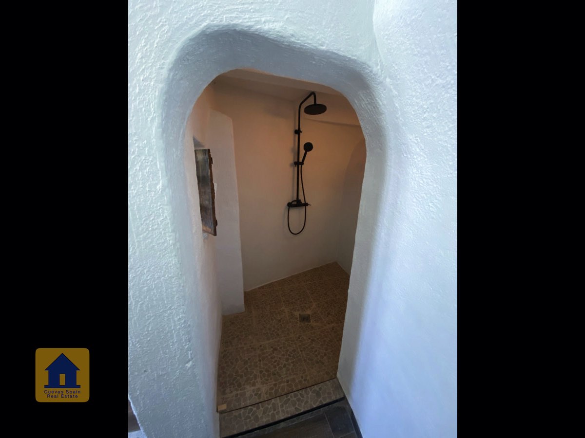 La maison troglodyte comprend un hall d'entrée, un séjour/cuisine ouvert avec un bar à petit-déjeuner de comptoir, une salle à manger, deux chambres doubles, deux salles de bain complètes et une buanderie.