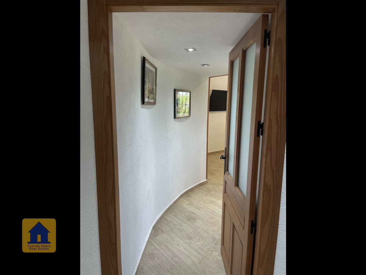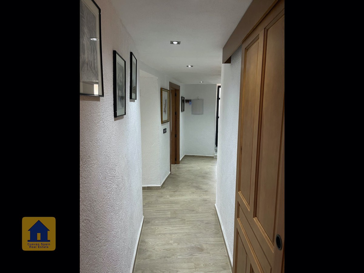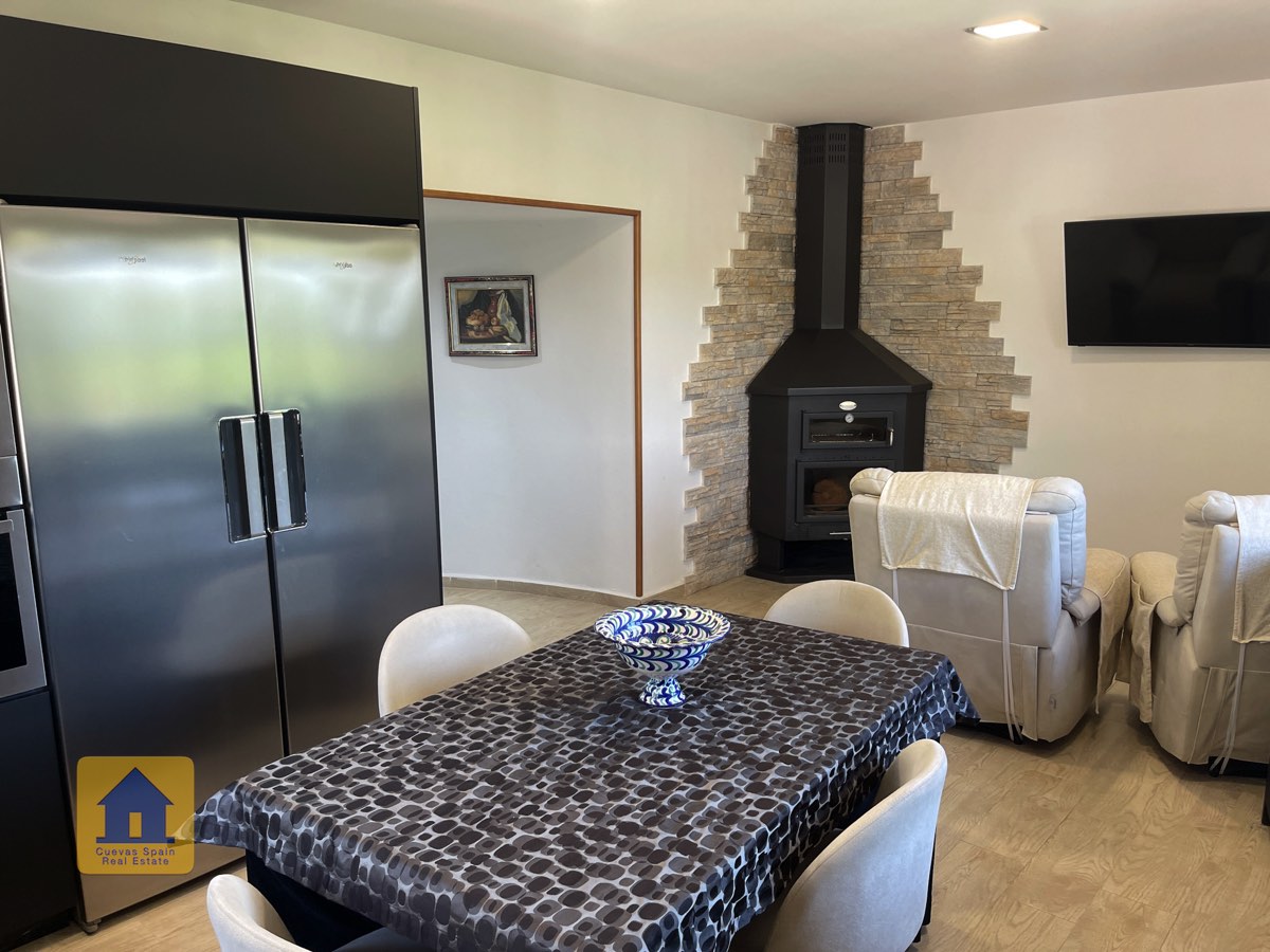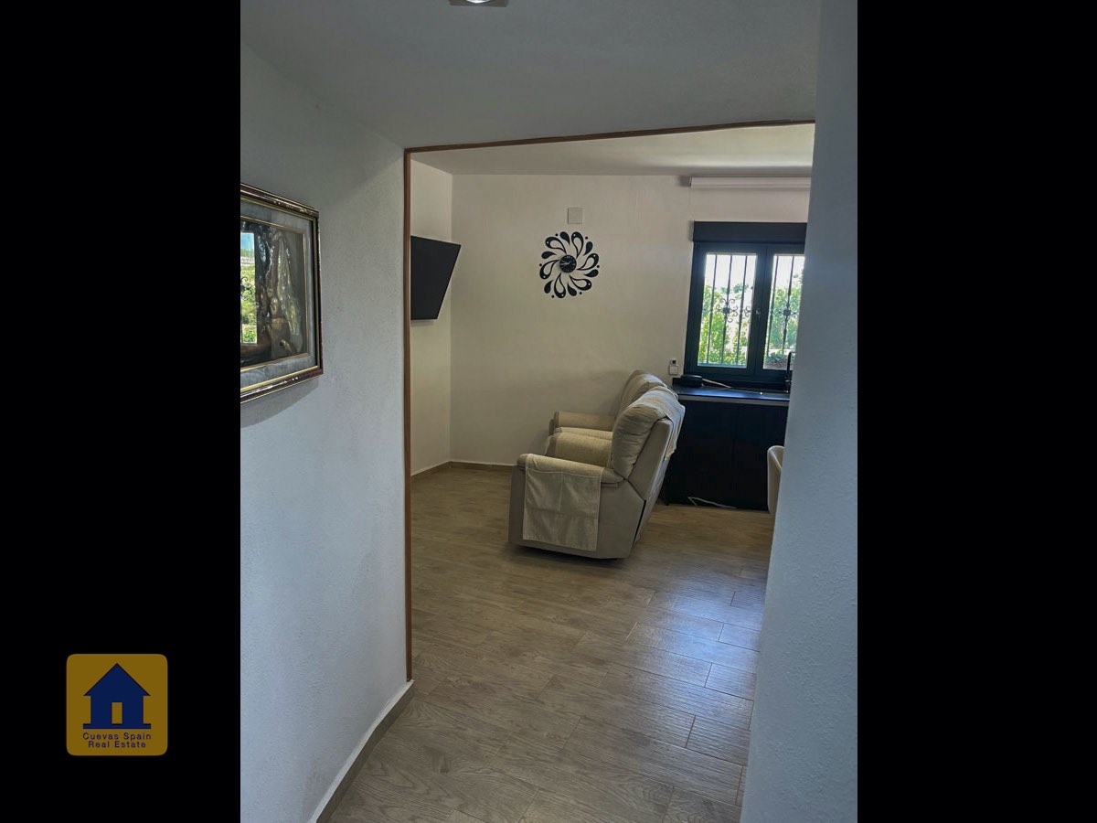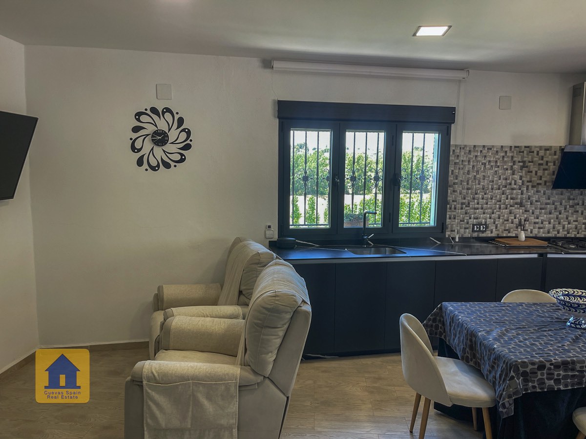 En toda la cueva y toda la zona de construcción se ha cuidado cuidadosamente la iluminación instalada. Las ventanas de la cocina y puertas de vidrio que dan a dos de las terrazas también dejan entrar mucha luz natural. Los suelos son de baldosas de estilo madera clara y los muebles combinan a la perfección con la decoración. (La mesa de comedor de madera no está incluida en la venta).