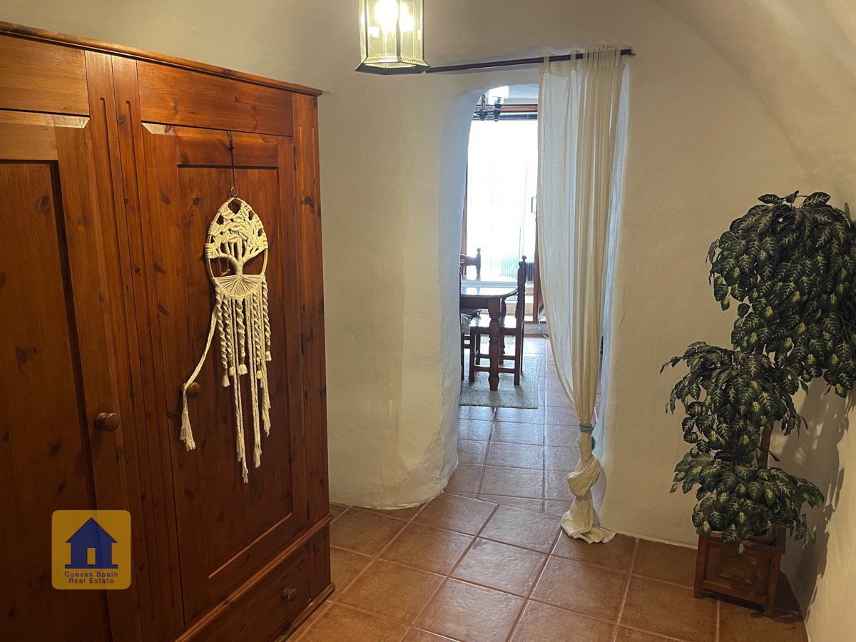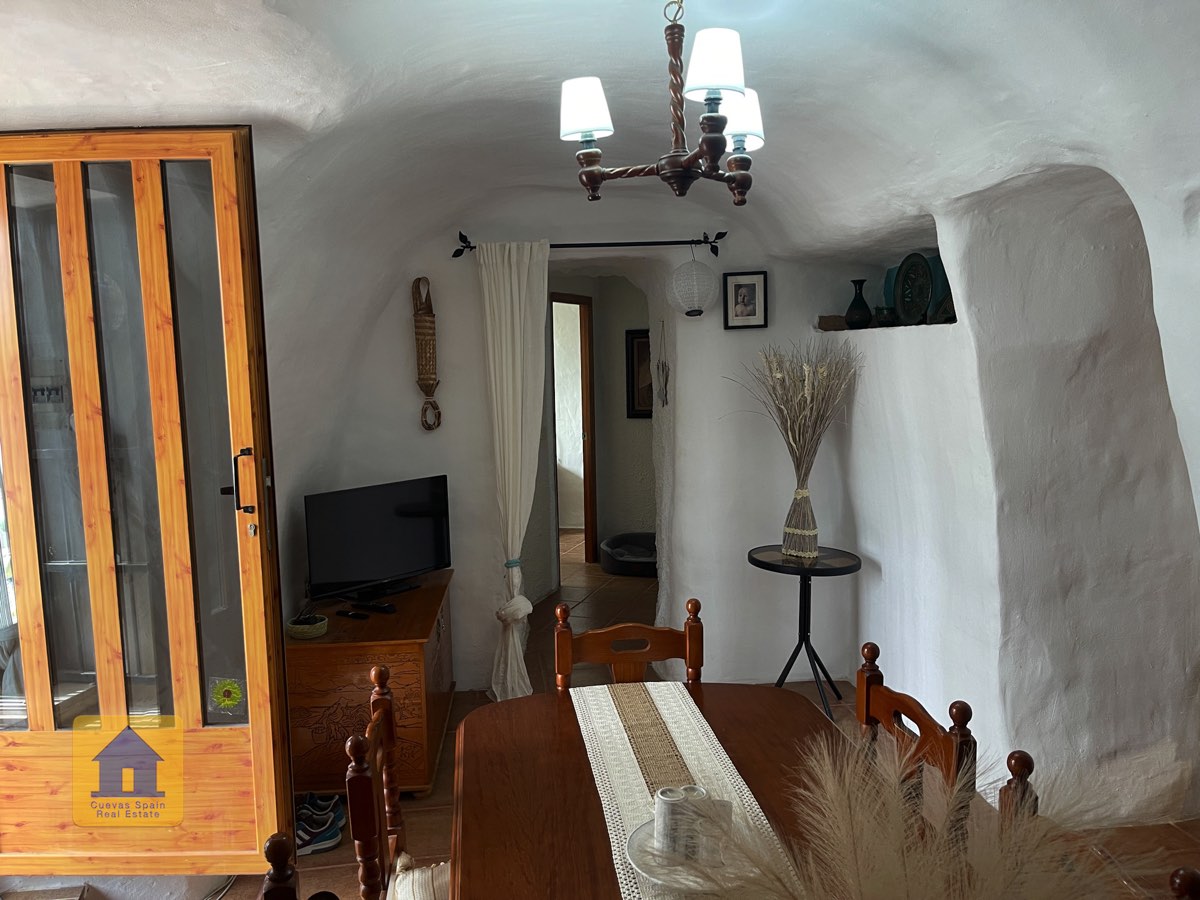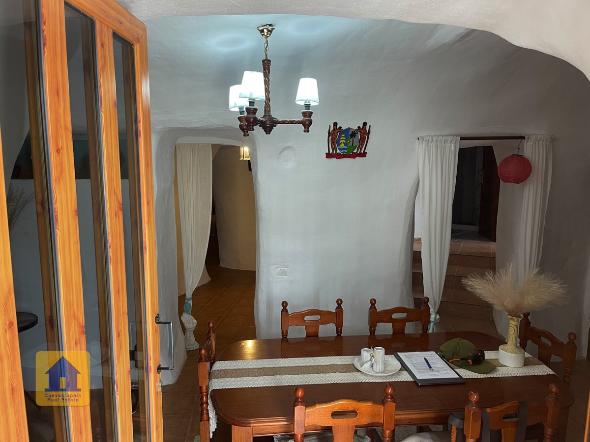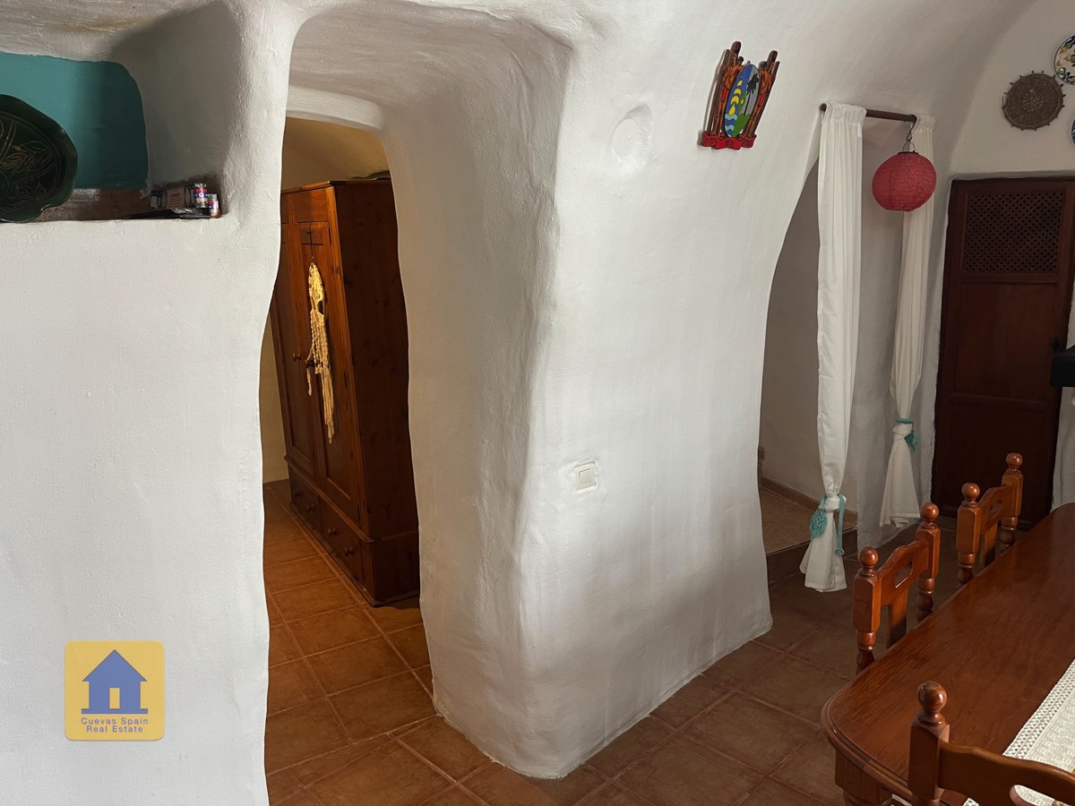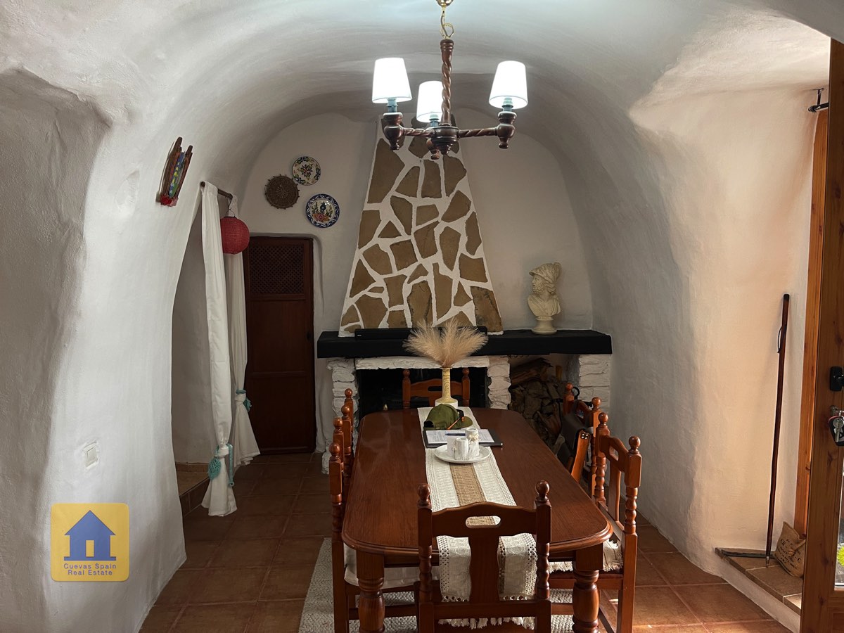 La casa es completamente cueva, a excepción de la cocina, que está de obra. Se accede a través de puertas dobles al comedor, que cuenta con estufa de leña, chimenea y despensa o almacenamiento. A la izquierda hay dos dormitorios: uno con armario empotrado y ventana al patio, y el otro, más grande, actualmente vestidor. Directamente desde el comedor, un amplio pasillo con un mueble de almacenamiento de madera de calidad conduce a un amplio salón con tragaluz y estufa de pellets, y al tercer dormitorio con armario empotrado. A la derecha del comedor se encuentran el baño completo, con acabados de alta calidad, y la espaciosa y soleada cocina-comedor completamente alicatada.