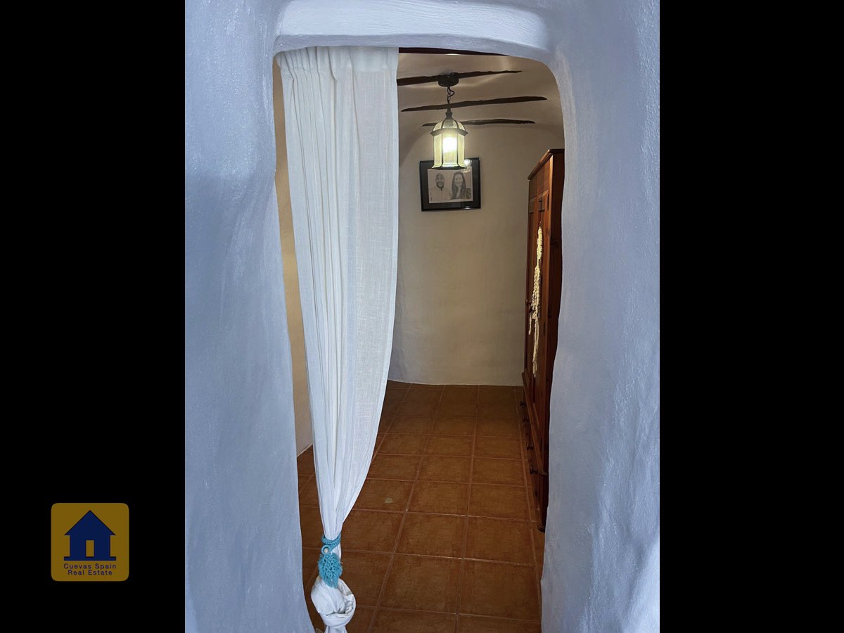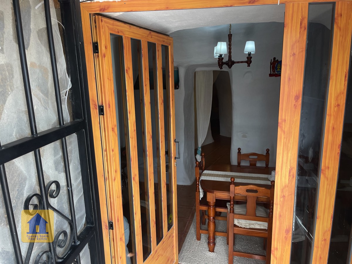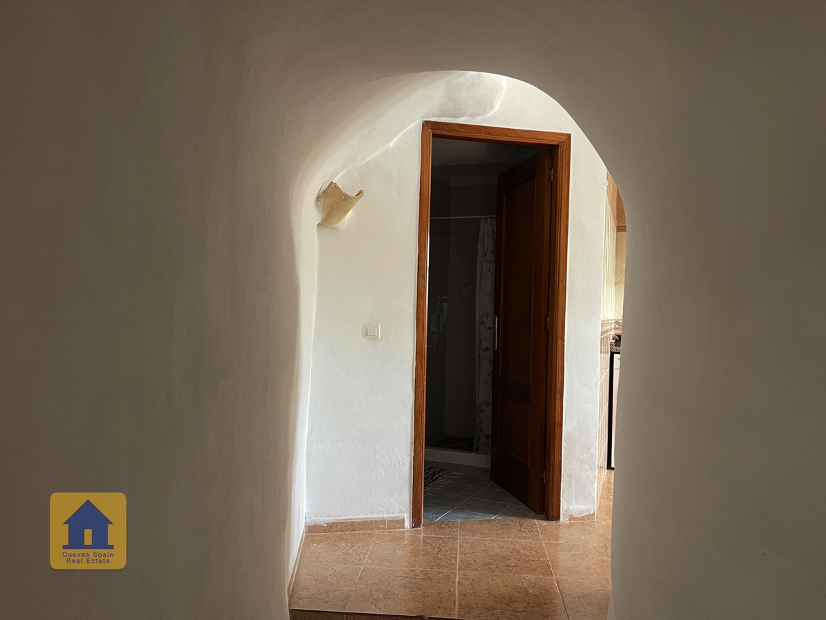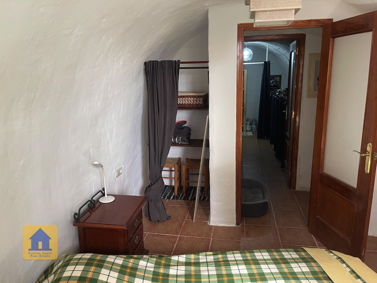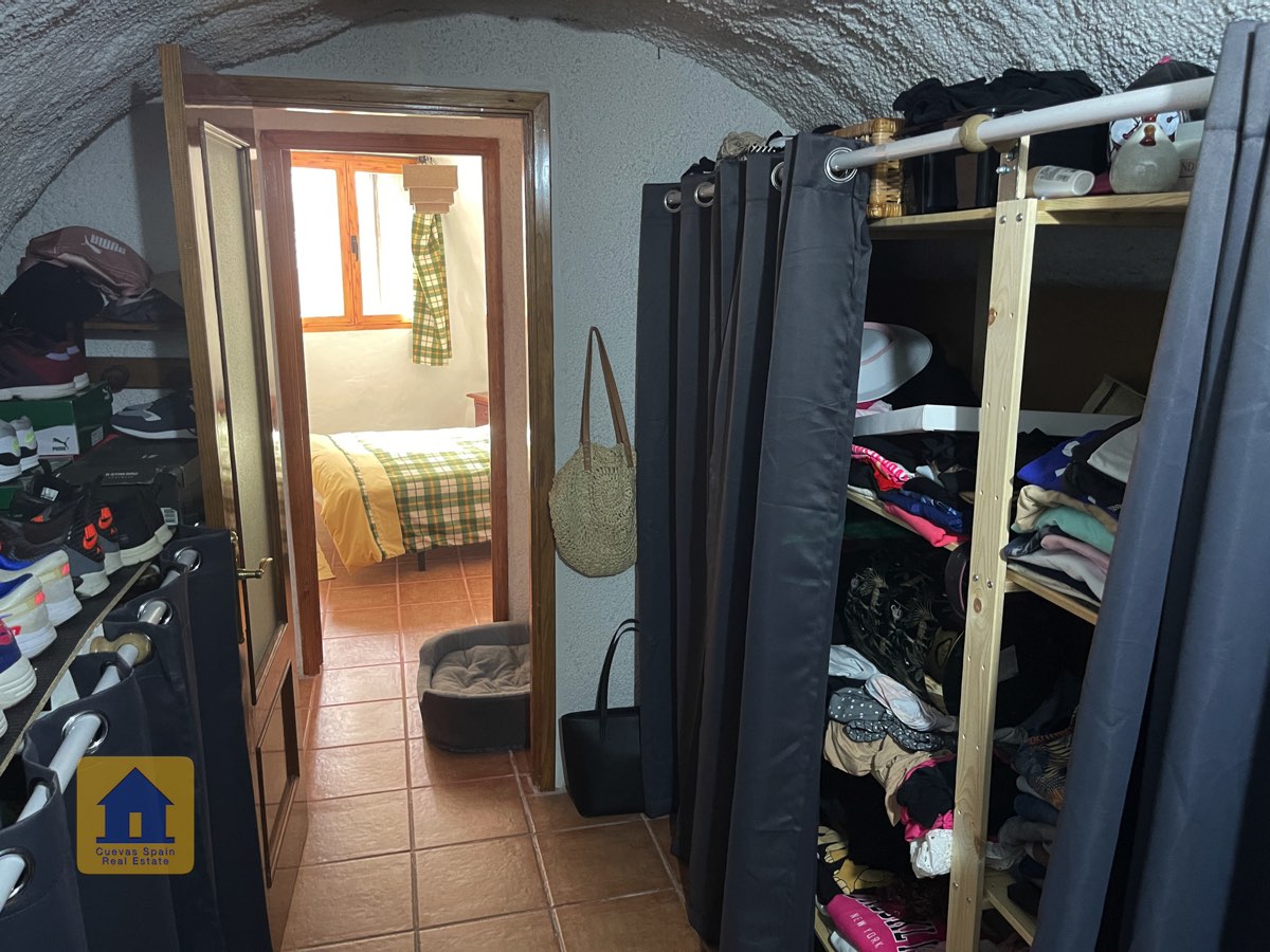 La casa es completamente cueva, a excepción de la cocina, que está de obra. Se accede a través de puertas dobles al comedor, que cuenta con estufa de leña, chimenea y despensa o almacenamiento. A la izquierda hay dos dormitorios: uno con armario empotrado y ventana al patio, y el otro, más grande, actualmente vestidor. Directamente desde el comedor, un amplio pasillo con un mueble de almacenamiento de madera de calidad conduce a un amplio salón con tragaluz y estufa de pellets, y al tercer dormitorio con armario empotrado. A la derecha del comedor se encuentran el baño completo, con acabados de alta calidad, y la espaciosa y soleada cocina-comedor completamente alicatada.