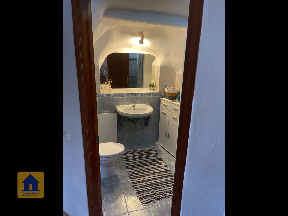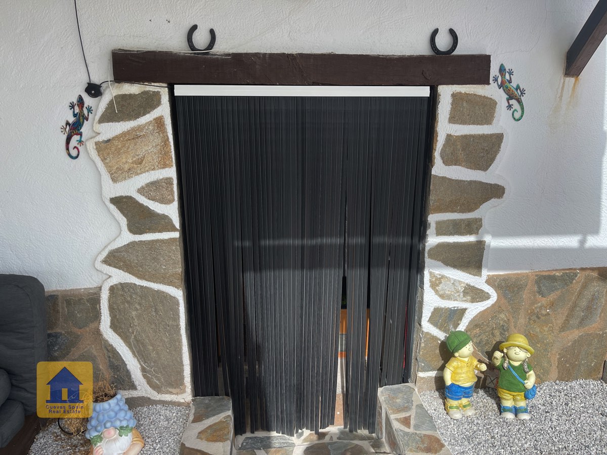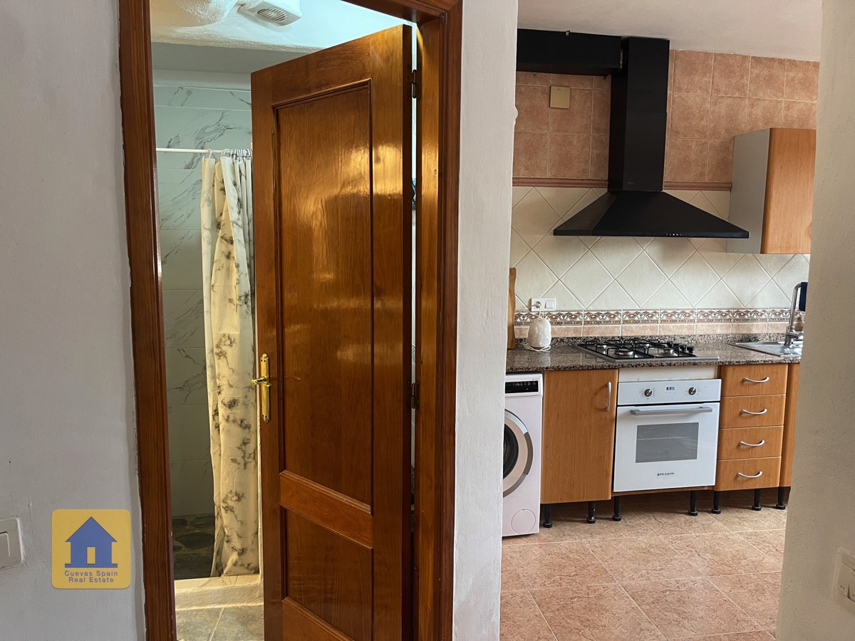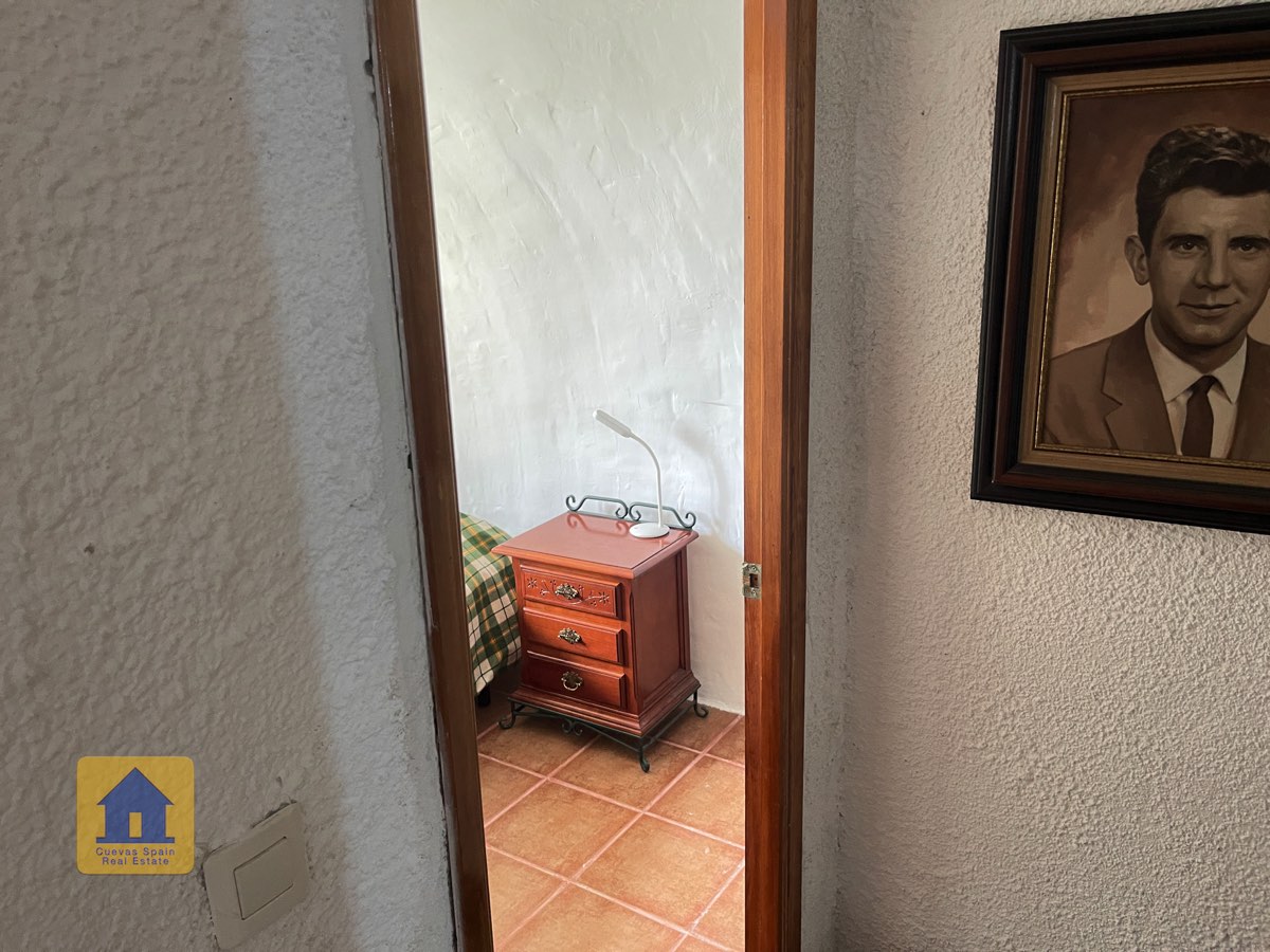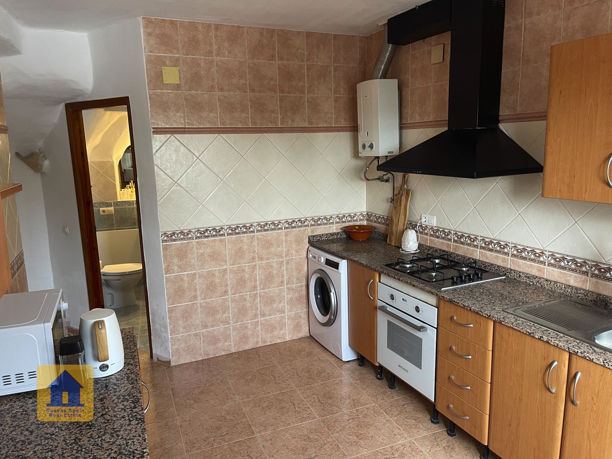 La casa es completamente cueva, a excepción de la cocina, que está de obra. Se accede a través de puertas dobles al comedor, que cuenta con estufa de leña, chimenea y despensa o almacenamiento. A la izquierda hay dos dormitorios: uno con armario empotrado y ventana al patio, y el otro, más grande, actualmente vestidor. Directamente desde el comedor, un amplio pasillo con un mueble de almacenamiento de madera de calidad conduce a un amplio salón con tragaluz y estufa de pellets, y al tercer dormitorio con armario empotrado. A la derecha del comedor se encuentran el baño completo, con acabados de alta calidad, y la espaciosa y soleada cocina-comedor completamente alicatada.