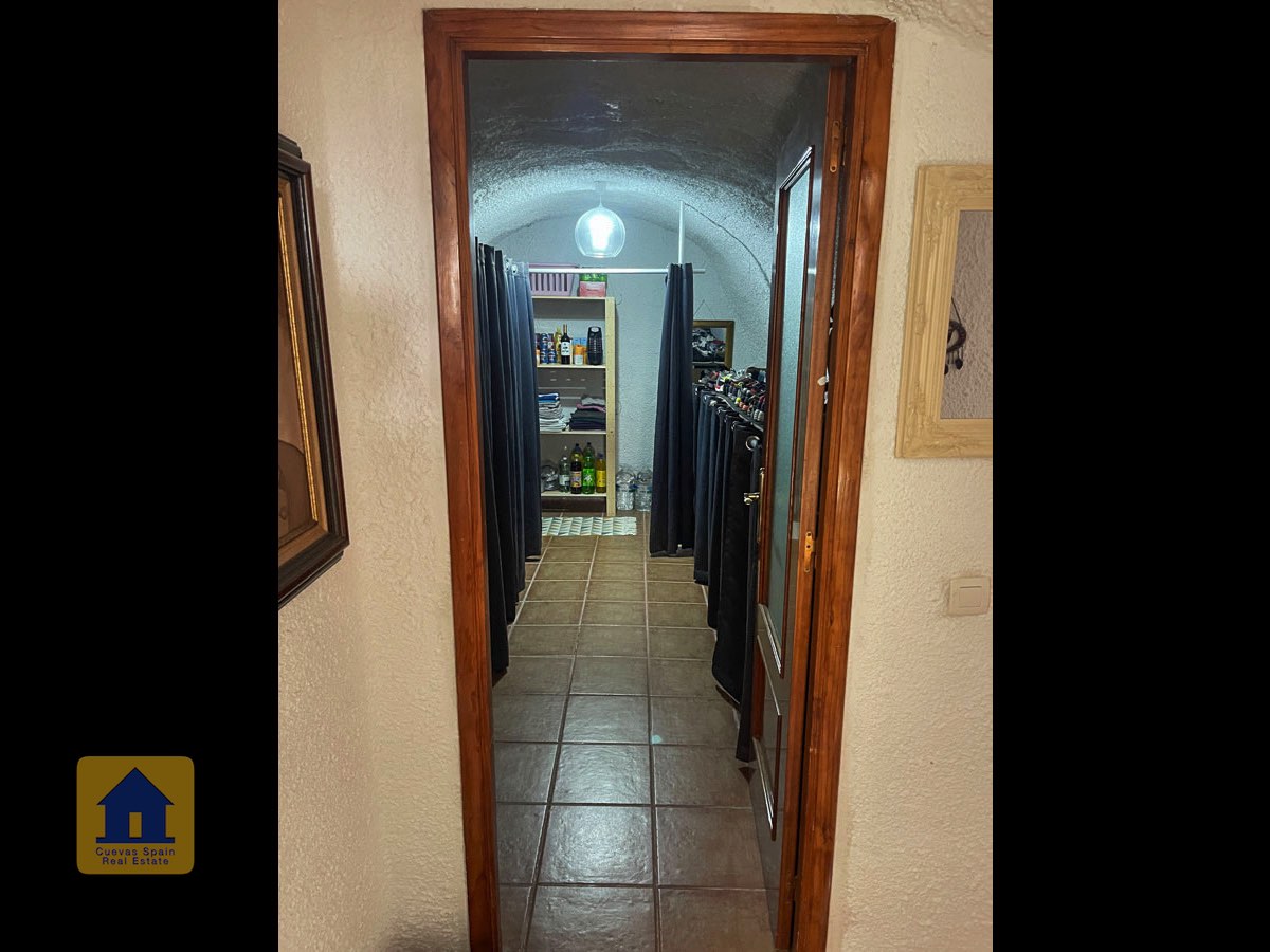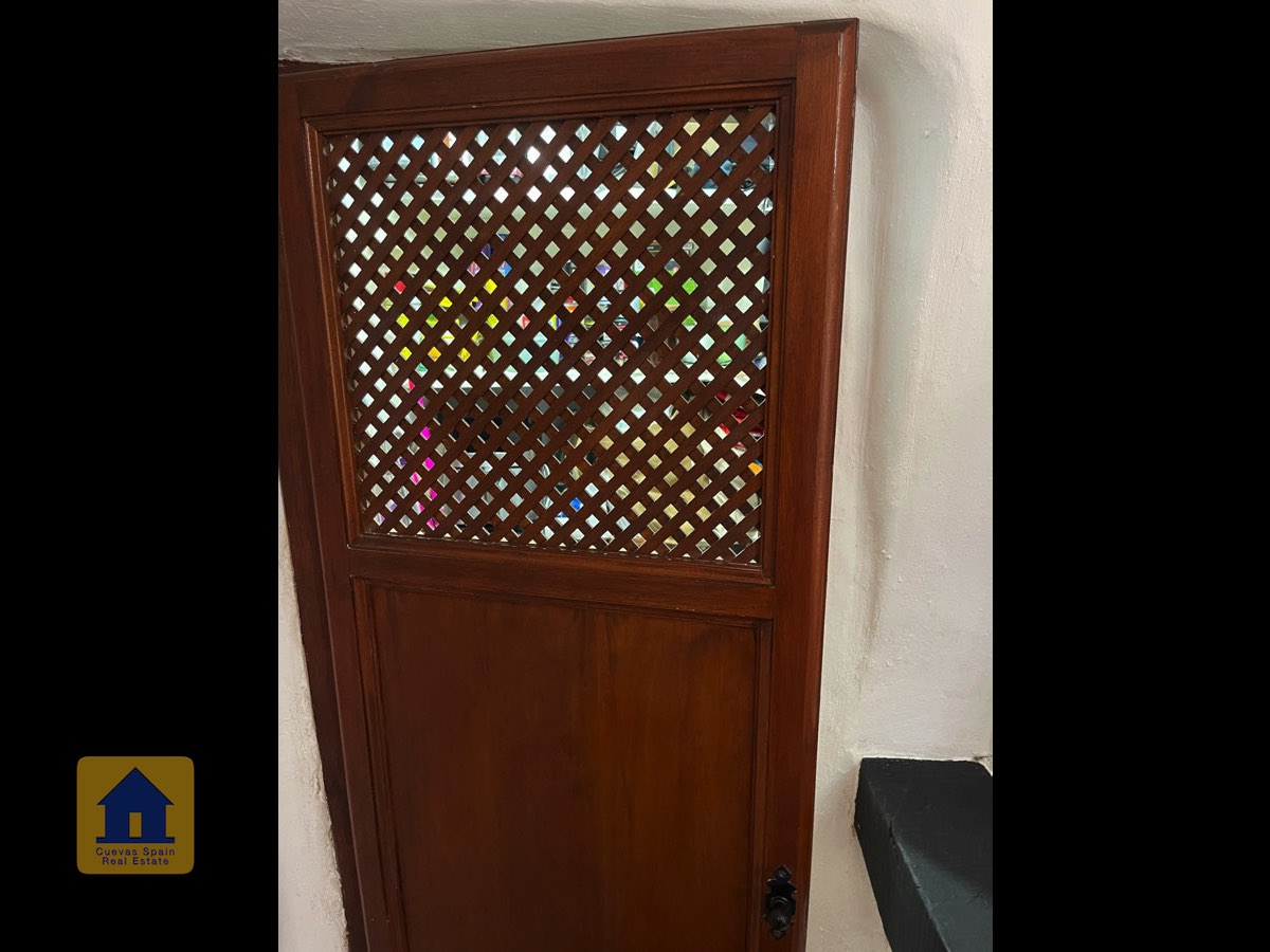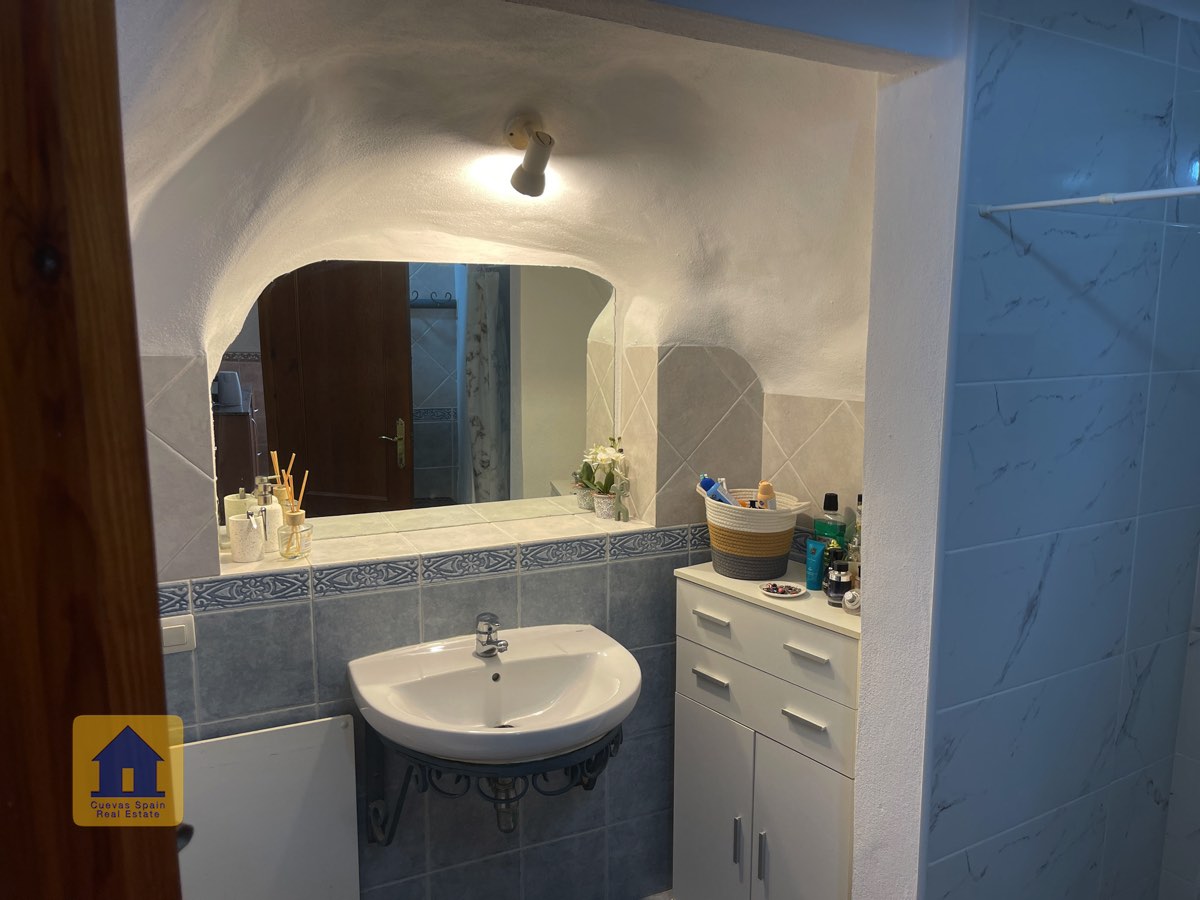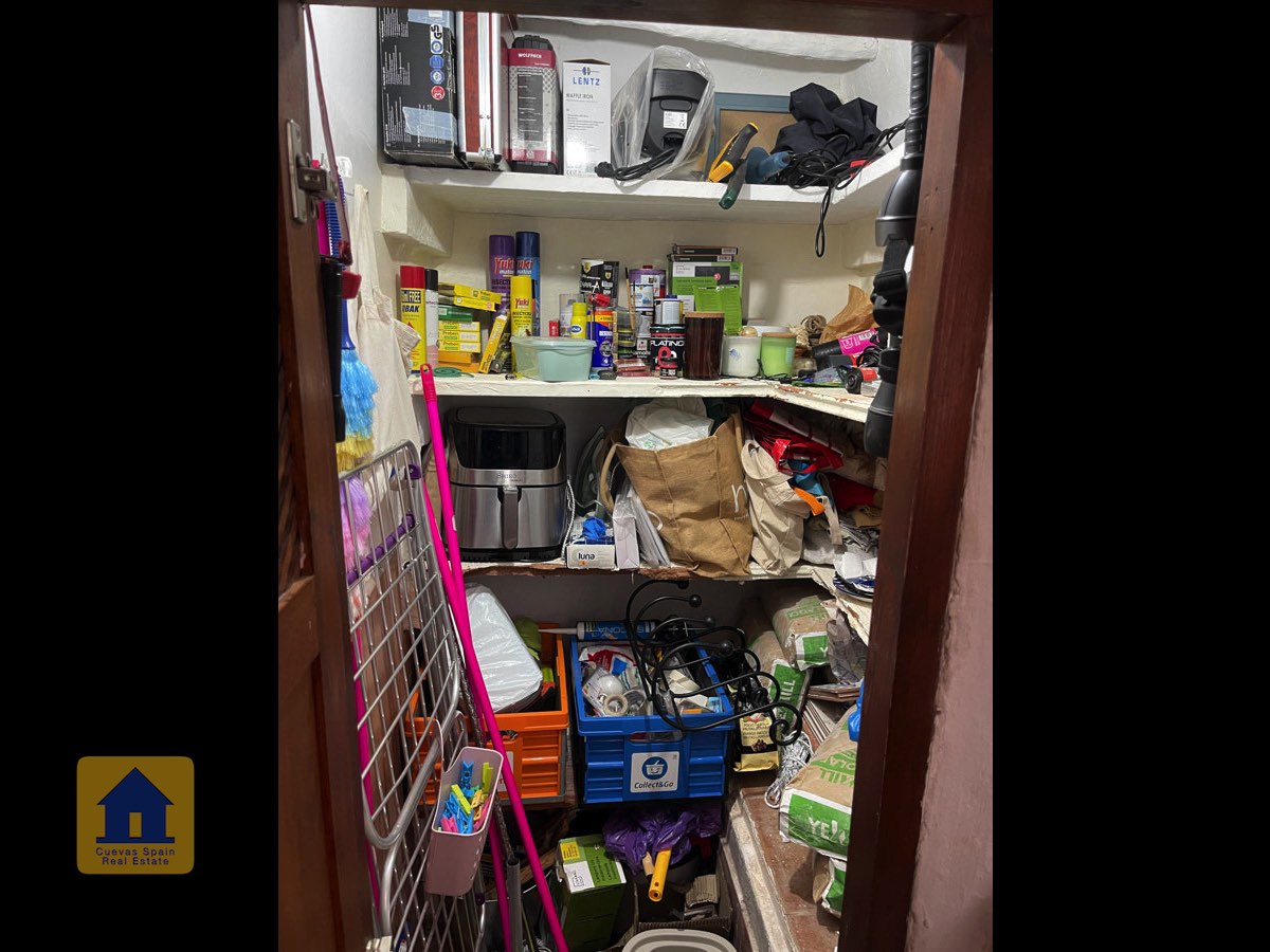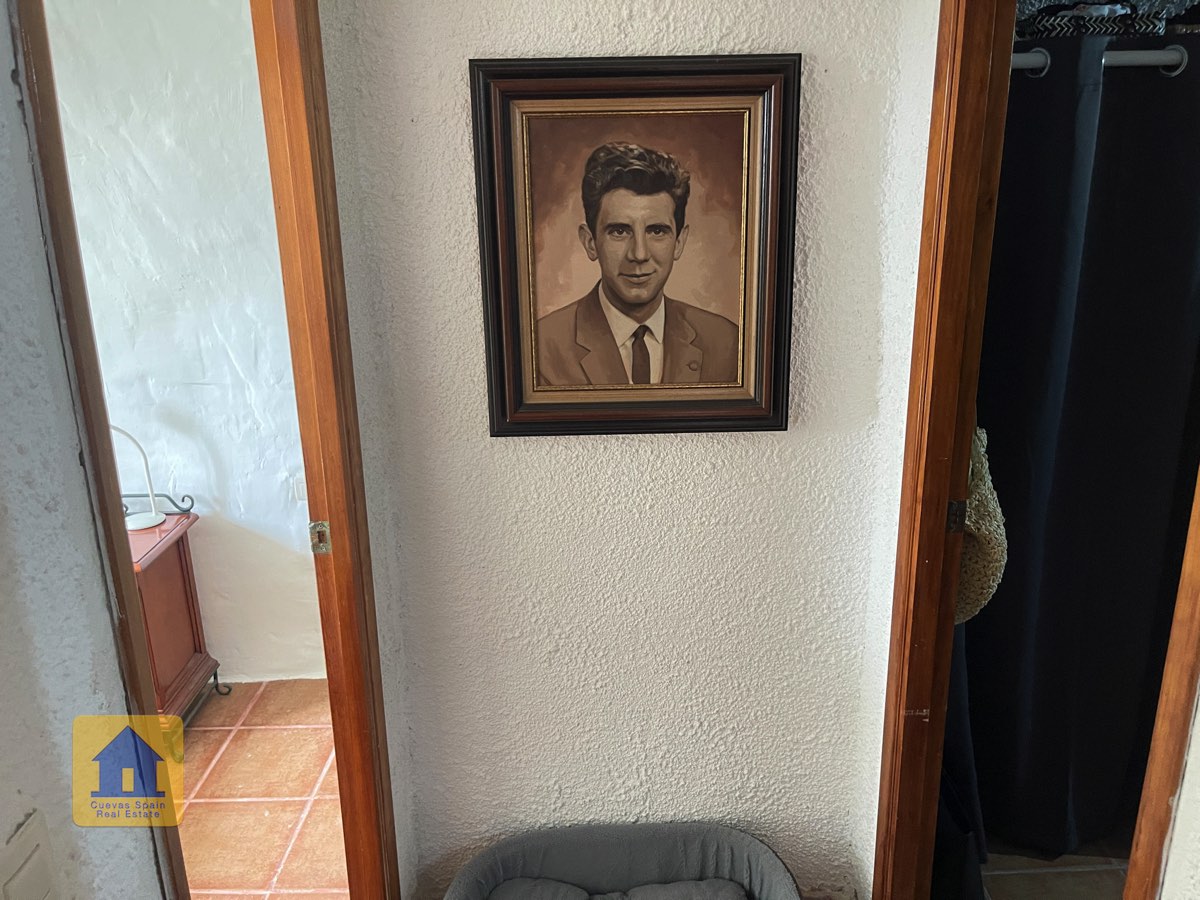 La casa es completamente cueva, a excepción de la cocina, que está de obra. Se accede a través de puertas dobles al comedor, que cuenta con estufa de leña, chimenea y despensa o almacenamiento. A la izquierda hay dos dormitorios: uno con armario empotrado y ventana al patio, y el otro, más grande, actualmente vestidor. Directamente desde el comedor, un amplio pasillo con un mueble de almacenamiento de madera de calidad conduce a un amplio salón con tragaluz y estufa de pellets, y al tercer dormitorio con armario empotrado. A la derecha del comedor se encuentran el baño completo, con acabados de alta calidad, y la espaciosa y soleada cocina-comedor completamente alicatada.