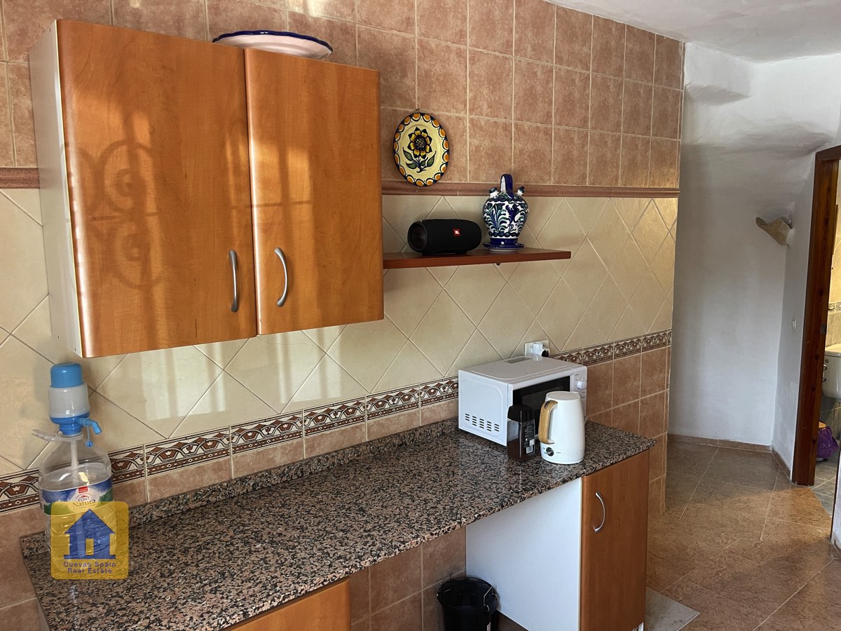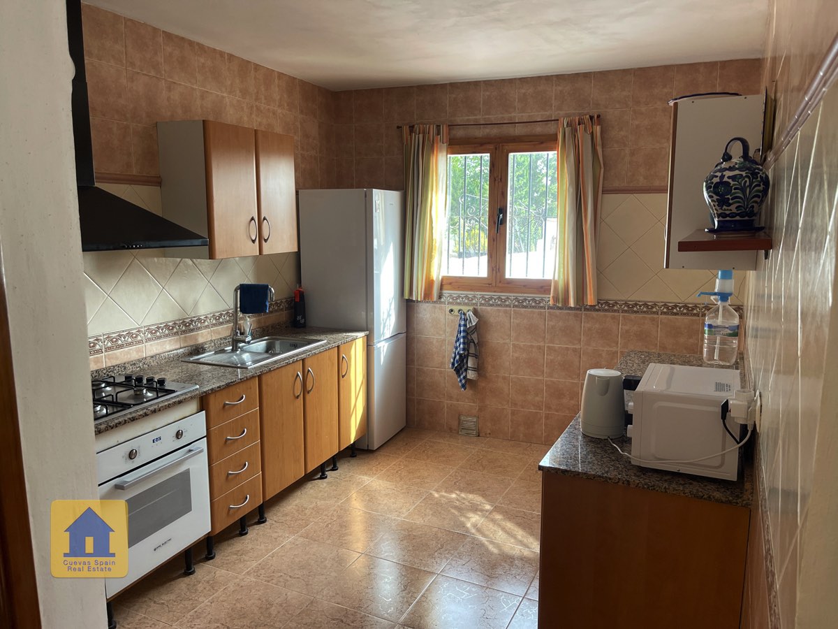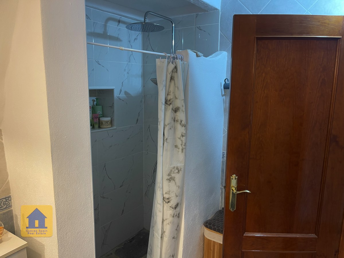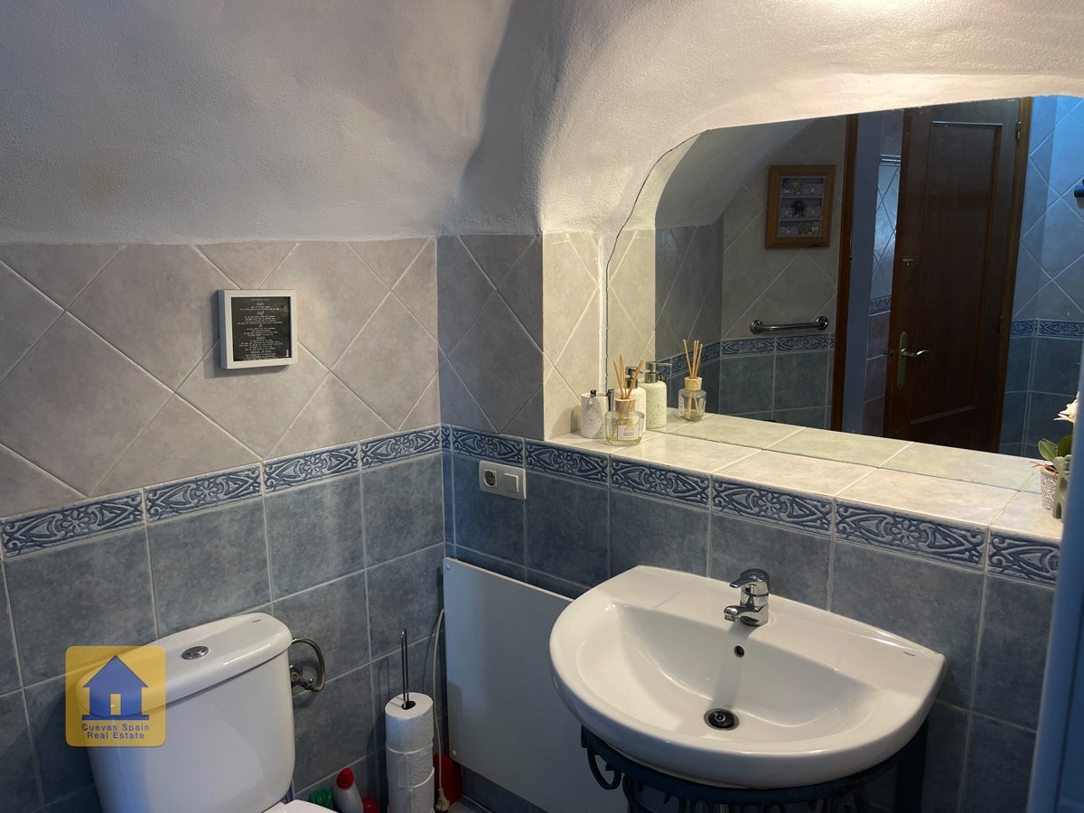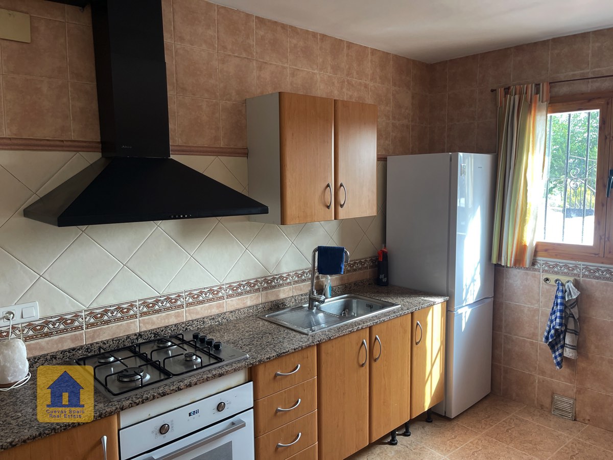 La casa es completamente cueva, a excepción de la cocina, que está de obra. Se accede a través de puertas dobles al comedor, que cuenta con estufa de leña, chimenea y despensa o almacenamiento. A la izquierda hay dos dormitorios: uno con armario empotrado y ventana al patio, y el otro, más grande, actualmente vestidor. Directamente desde el comedor, un amplio pasillo con un mueble de almacenamiento de madera de calidad conduce a un amplio salón con tragaluz y estufa de pellets, y al tercer dormitorio con armario empotrado. A la derecha del comedor se encuentran el baño completo, con acabados de alta calidad, y la espaciosa y soleada cocina-comedor completamente alicatada.