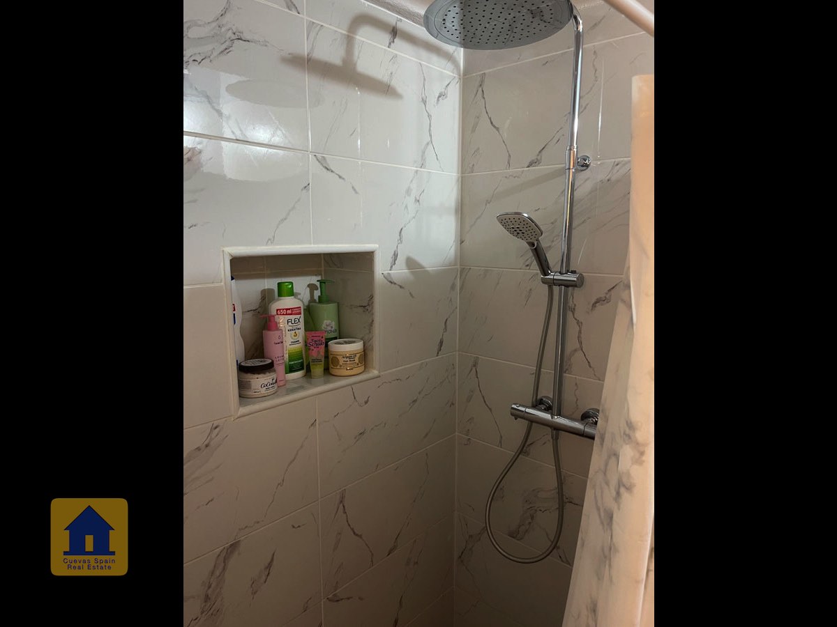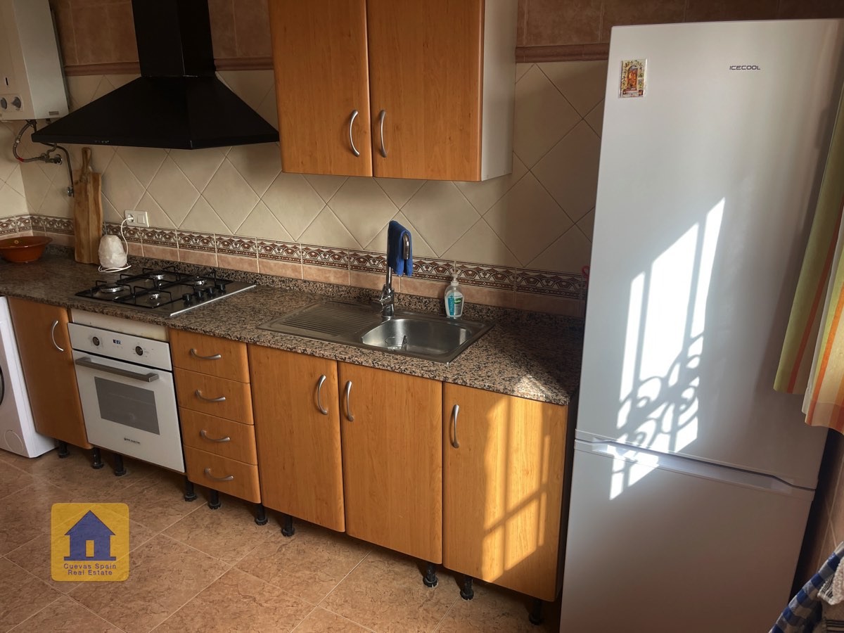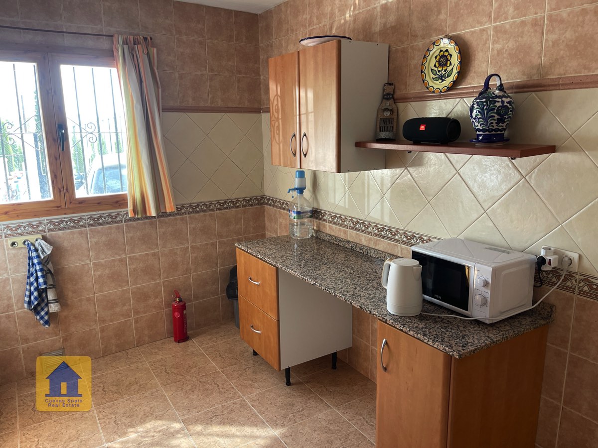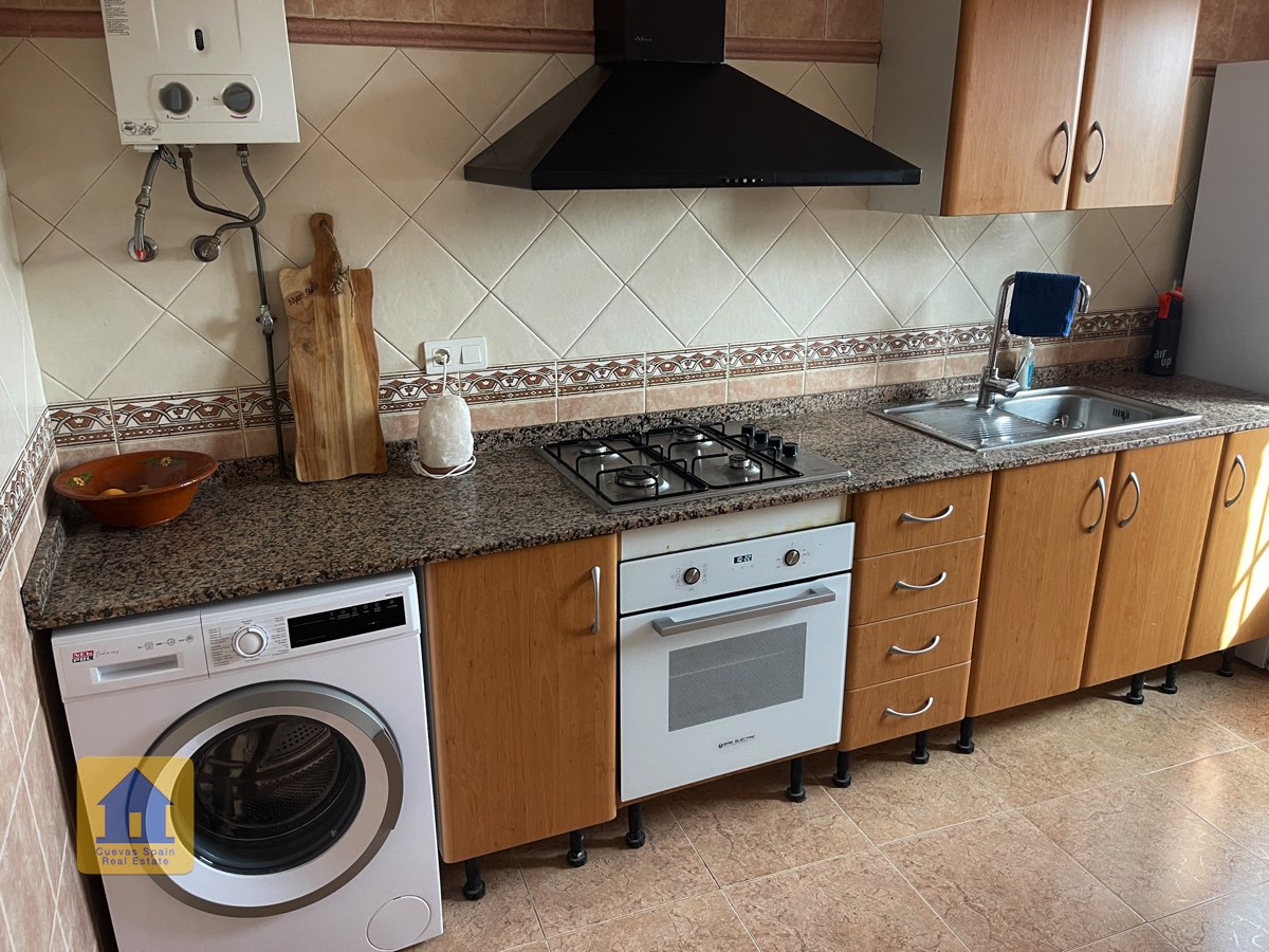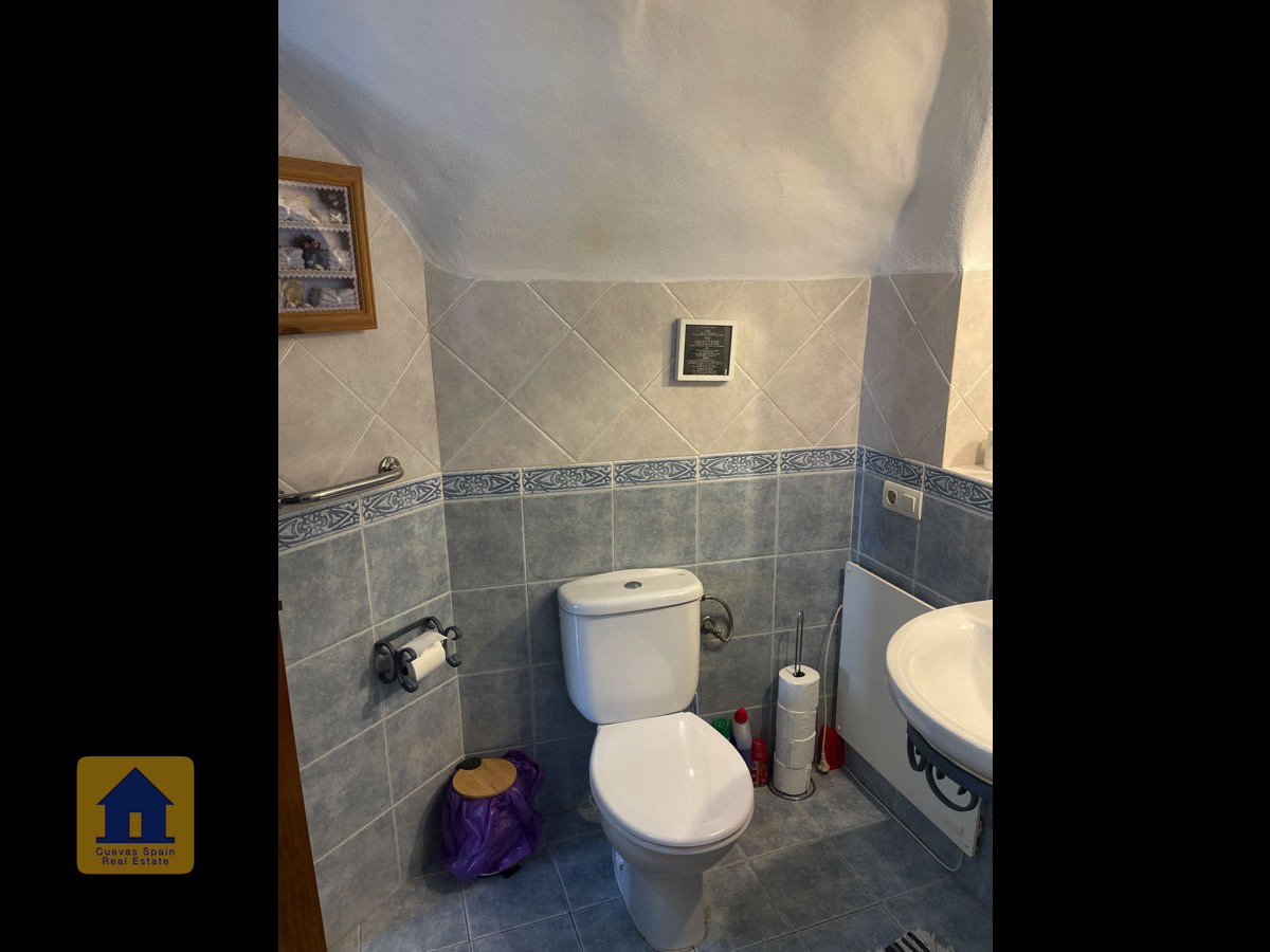 La casa es completamente cueva, a excepción de la cocina, que está de obra. Se accede a través de puertas dobles al comedor, que cuenta con estufa de leña, chimenea y despensa o almacenamiento. A la izquierda hay dos dormitorios: uno con armario empotrado y ventana al patio, y el otro, más grande, actualmente vestidor. Directamente desde el comedor, un amplio pasillo con un mueble de almacenamiento de madera de calidad conduce a un amplio salón con tragaluz y estufa de pellets, y al tercer dormitorio con armario empotrado. A la derecha del comedor se encuentran el baño completo, con acabados de alta calidad, y la espaciosa y soleada cocina-comedor completamente alicatada.