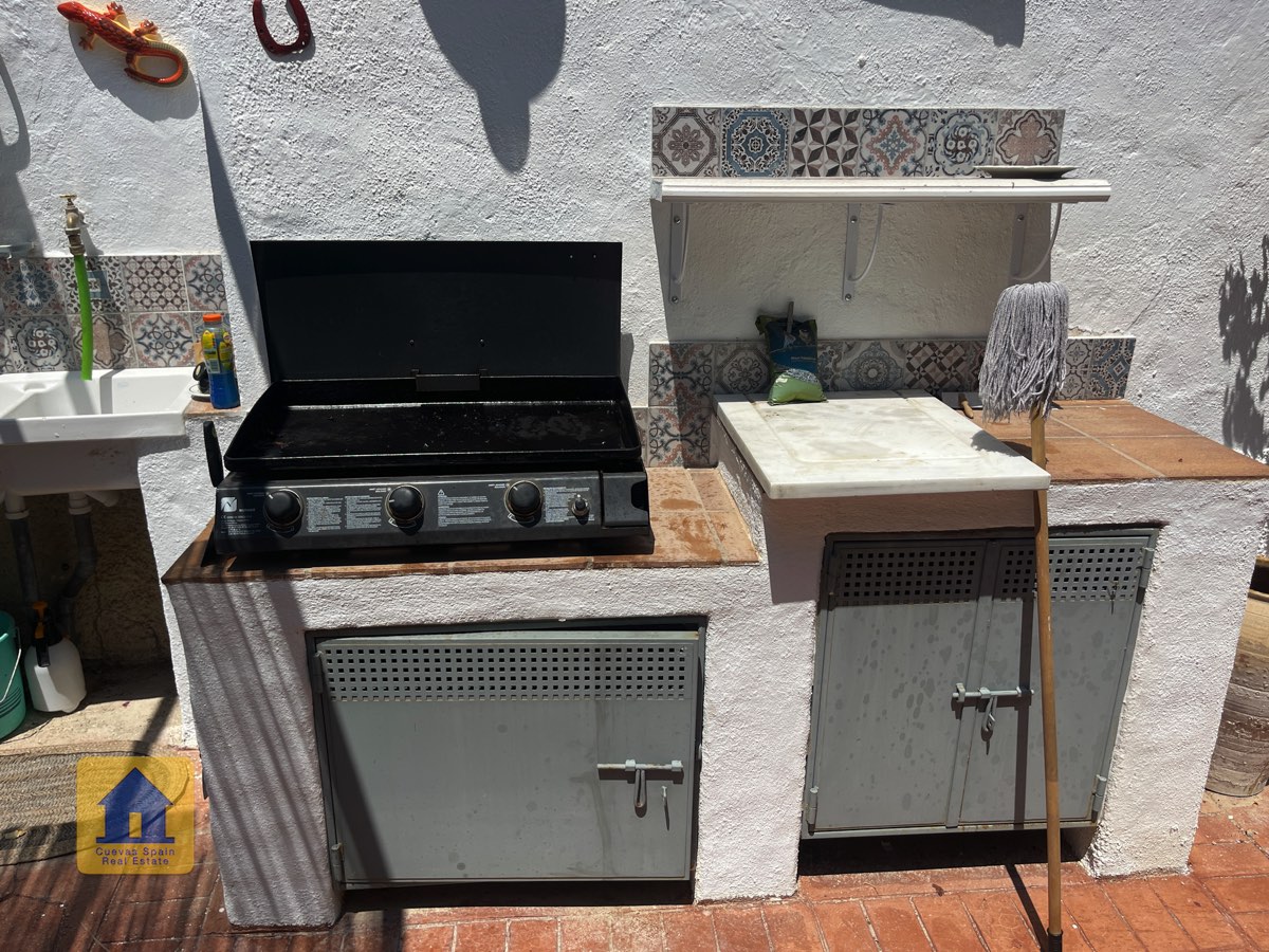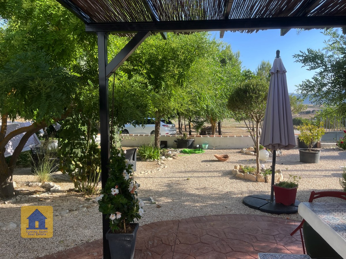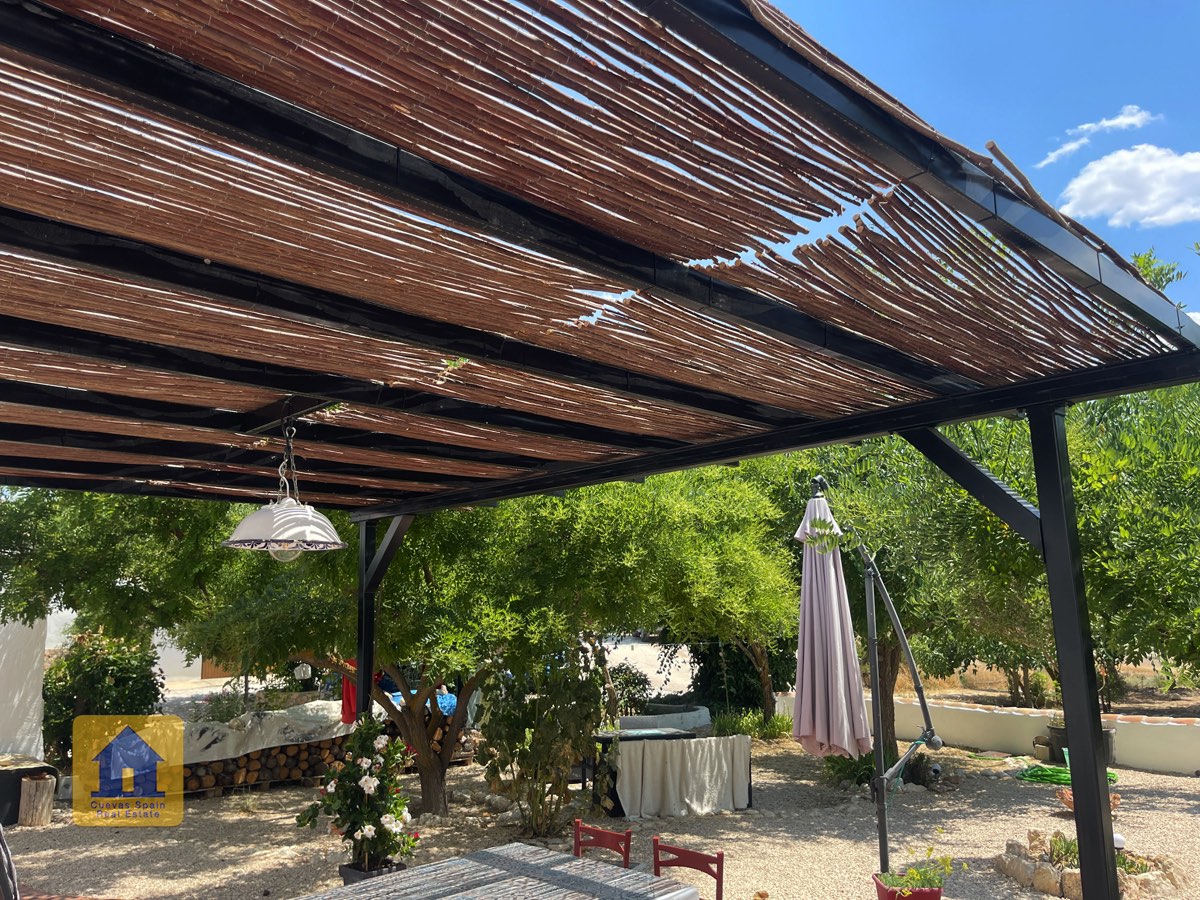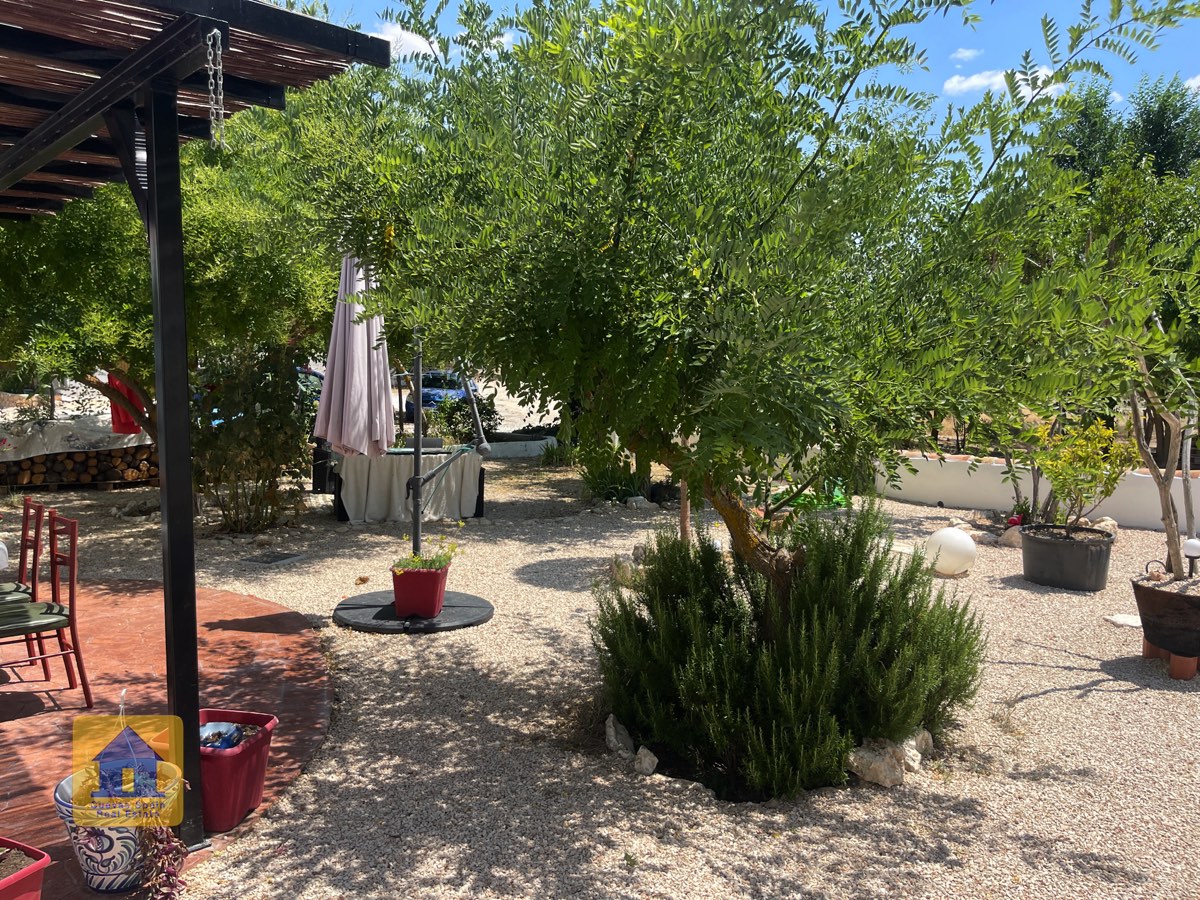 A côté de la cuisine, des portes coulissantes en verre s’ouvrent vers l’exterieure sur un coin salon frais et ombragé, qui donne sur le jardin. Sur la partie carrelée du patio se trouve un coin repas sous la pergola. Une cuisine d'été est équipée de deux éviers, d'un robinet et d'un barbecue à gaz. Dans le jardin on trouve de la lavande, des rosiers, un olivier, des amandiers et des acacias.