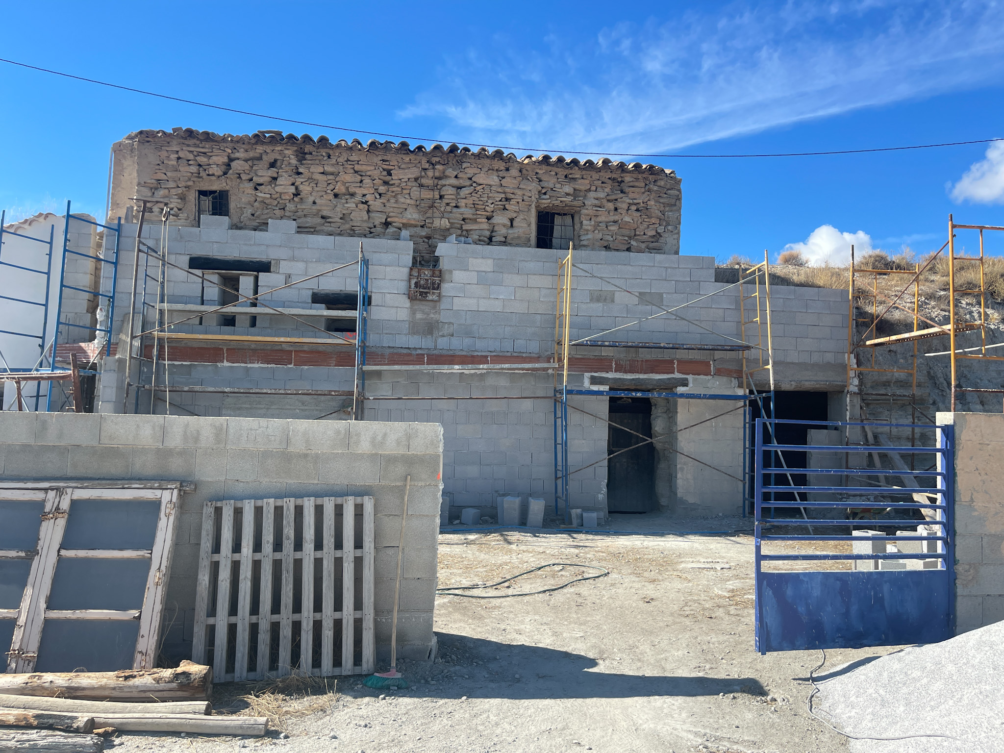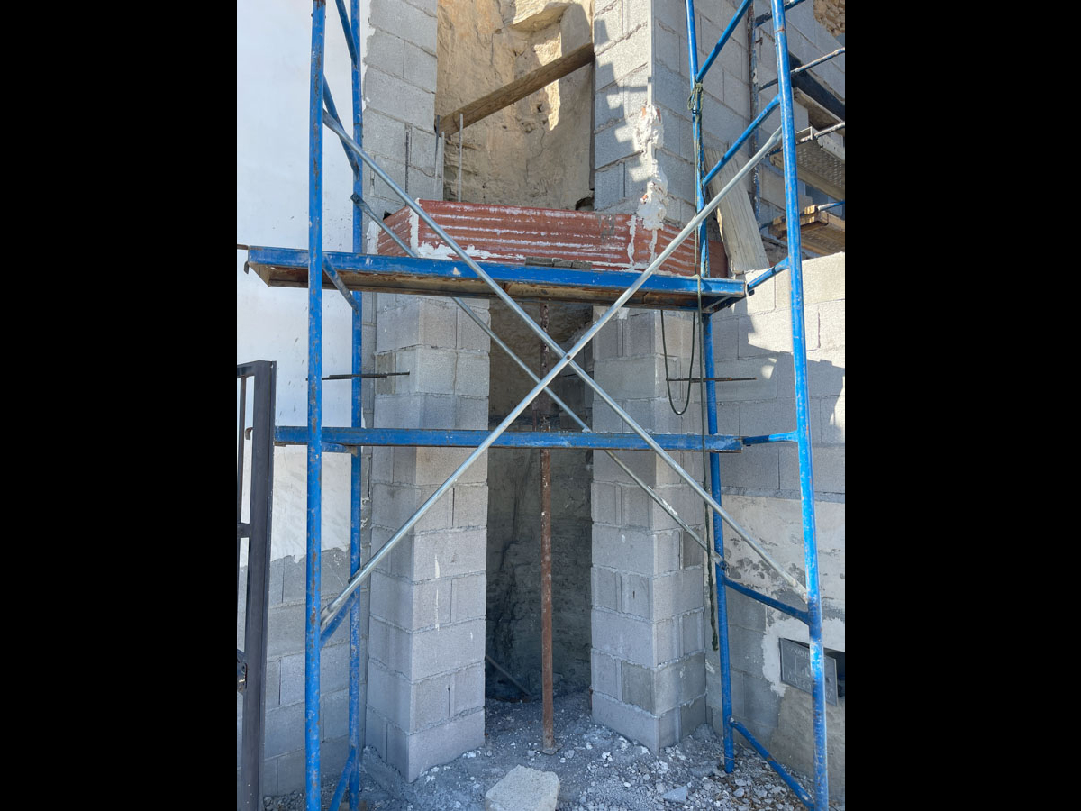 Des travaux de rénovation ont déjà été réalisés sur la façade de l’une des maisons dont la partie supérieure est dotée d'une structure auxiliaire non rénovée, en pierre.