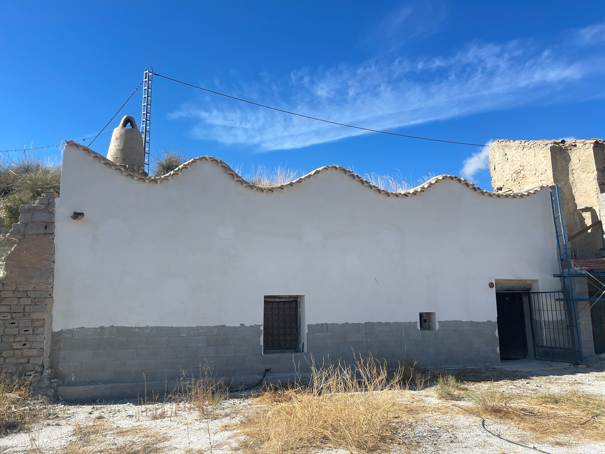 La seconde maison troglodyte présente une façade blanchie à la chaux, avec la finition ondulée caractéristique de la région.