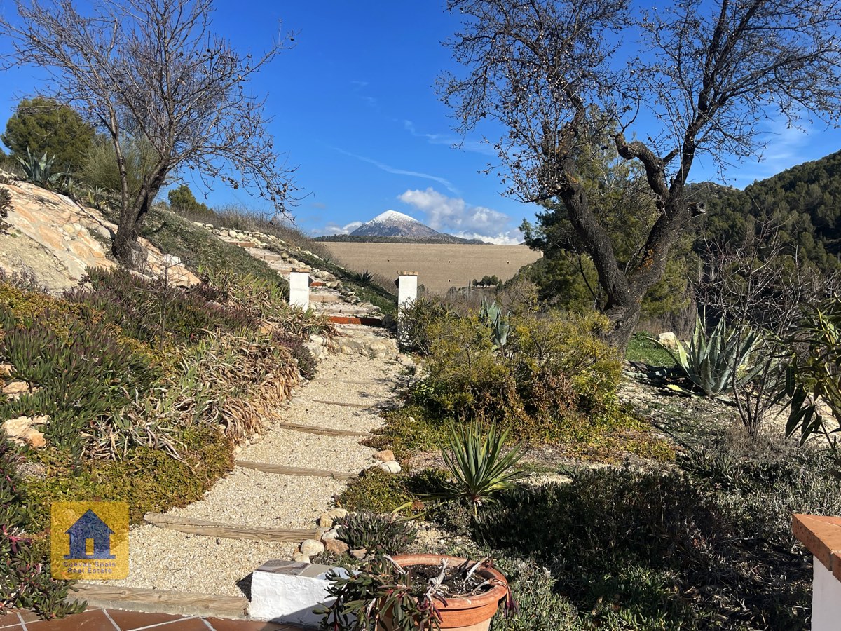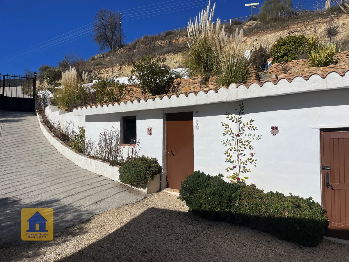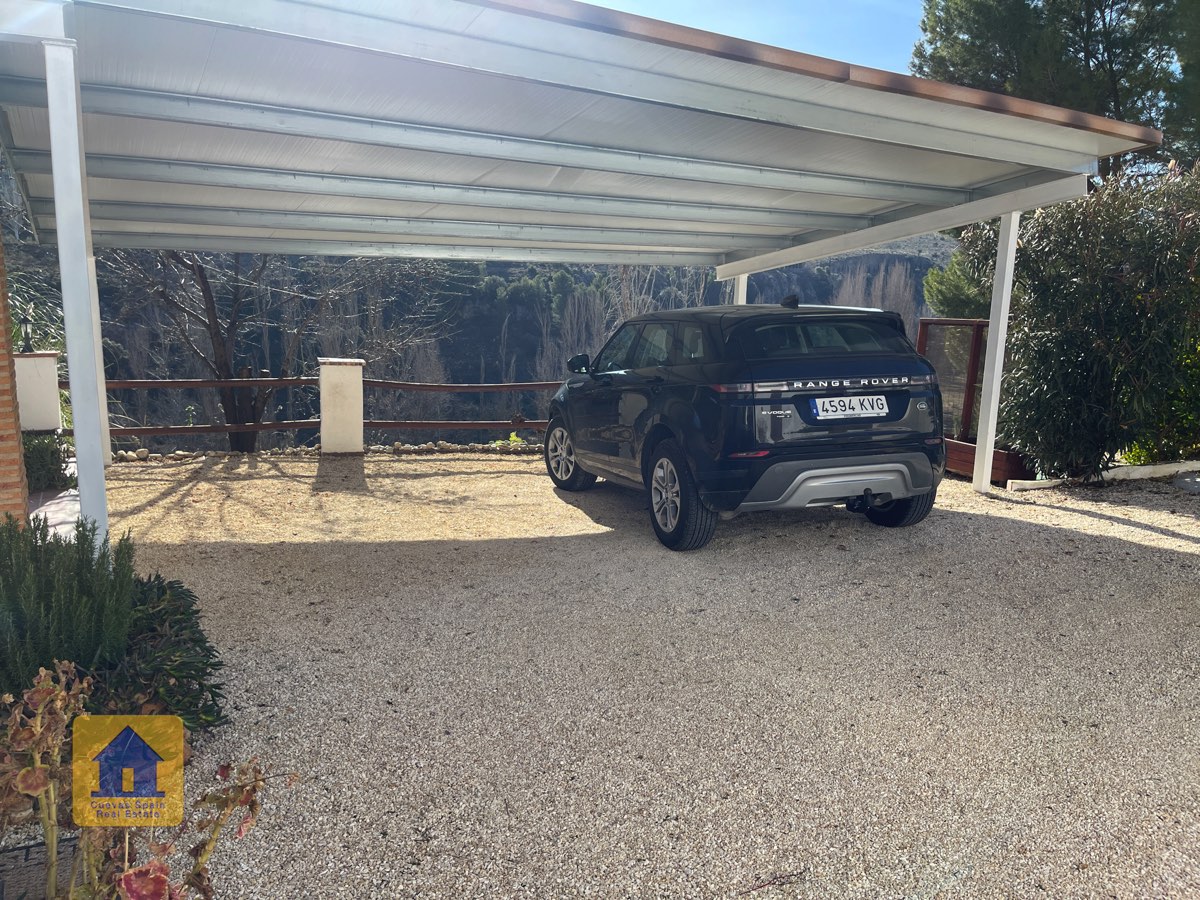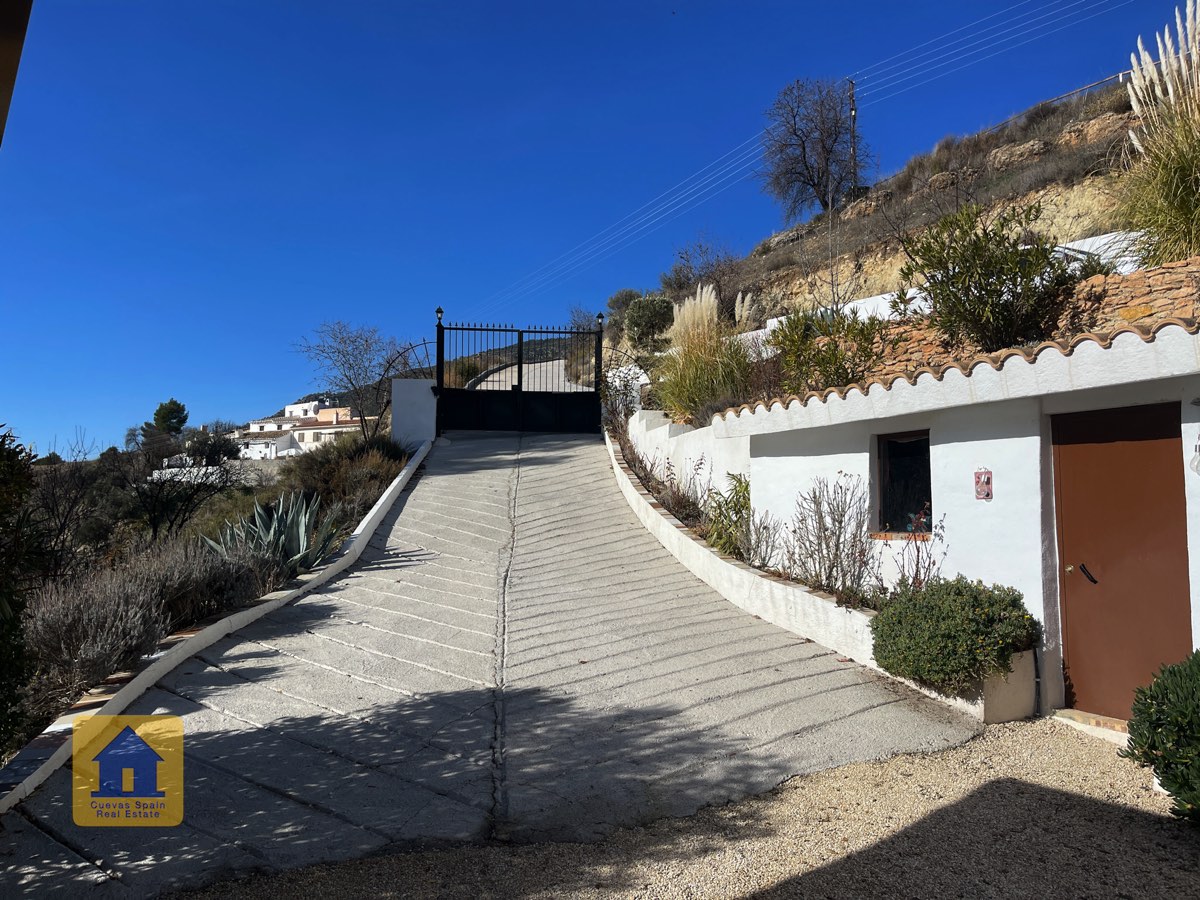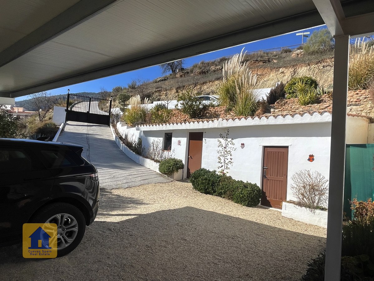 Juste à l’extérieur du portail d’entrée (mais sur la propriété), se trouve une place de parking privée, à côté d’un petit chemin bordé d’arbres fruitiers irrigués qui passe derrière la maison. On aperçoit le mont La Sagra au loin.